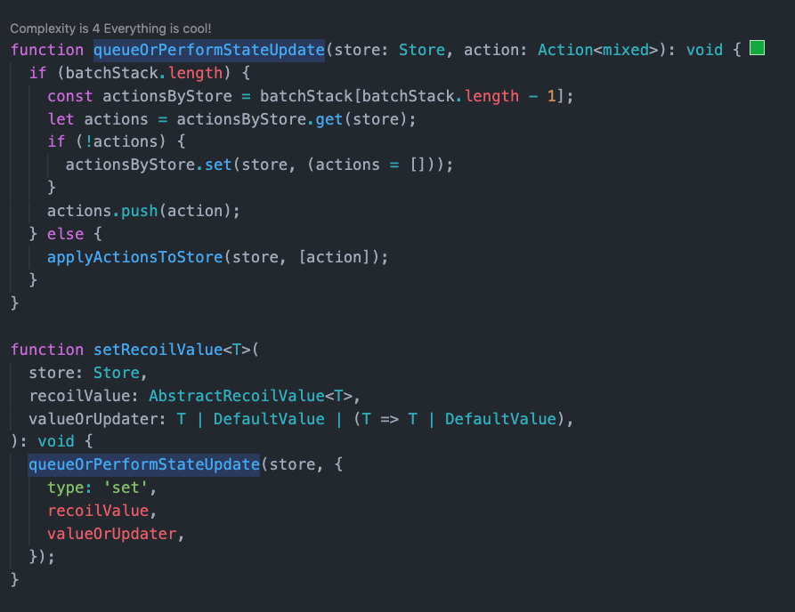 这个方法主要做了两件事情,一个是在 subscribeToRecoilValue 里面,将 key 和更新组件函数(红括号里面的)的映射关系存到 storeState 的 nodeToComponentSubscriptions 字段里面。