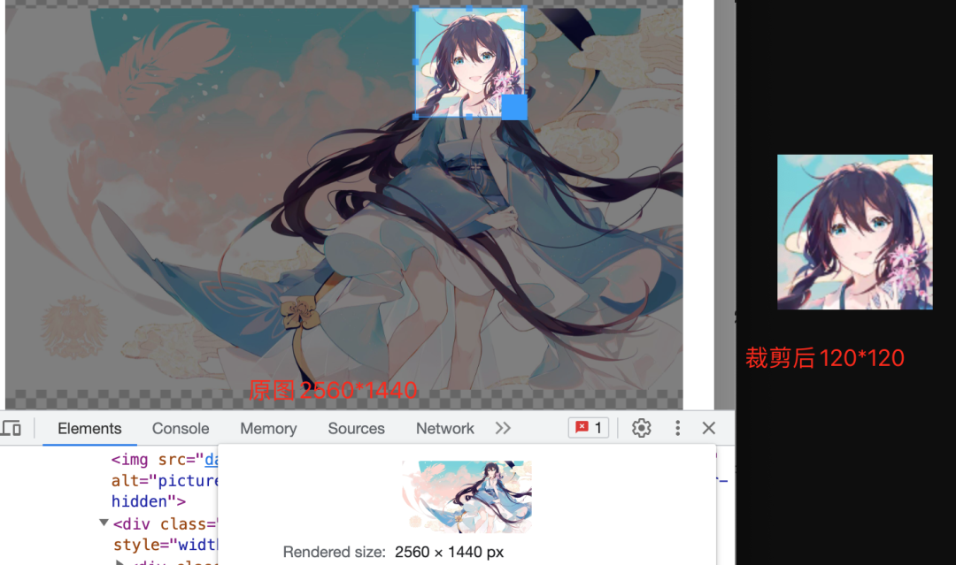 到这里,图片整个的裁剪压缩过程已完成了。我们来模拟下业务里的场景,比如用户上传的头像图片,最终尺寸为 120*120 差不多就够用了。看下实现的效果: