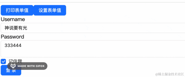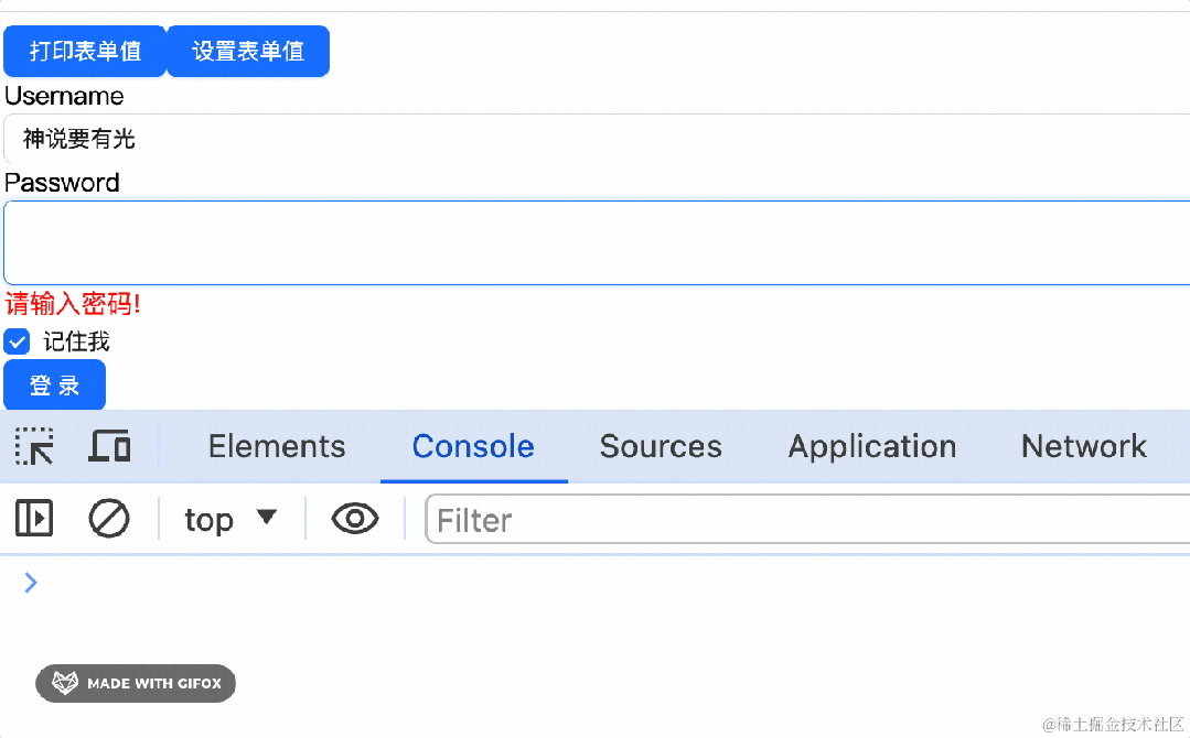 import { Button, Checkbox, Input } from "antd";import Form from "./Form/index";import { useEffect, useRef } from "react";import { FormRefApi } from "./Form/Form";const Basic: React.FC = () => { const onFinish = (values: any) => { console.log('Success:', values); }; const onFinishFailed = (errorInfo: any) => { console.log('Failed:', errorInfo); }; const form = useRef<FormRefApi>(null); return ( <> <Button type="primary" onClick={() => { console.log(form.current?.getFieldsValue()) }}>打印表单值</Button> <Button type="primary" onClick={() => { form.current?.setFieldsValue({ username: '东东东' }) }}>设置表单值</Button> <Form ref={form} initialValues={{ remember: true, username: '神说要有光' }} onFinish={onFinish} onFinishFailed={onFinishFailed} > <Form.Item label="Username" rules={[ { required: true, message: '请输入用户名!' }, { max: 6, message: '长度不能大于 6' } ]} > <Input /> </Form.Item> <Form.Item label="Password" rules={[{ required: true, message: '请输入密码!' }]} > <Input.TextArea /> </Form.Item> <Form.Item > 登录 </Button> </div> </Form.Item> </Form> </> );};export default Basic;当然,你也可以把 store 的 api 处理出来,然后封装个 useForm 的 hook 来传入 Form 组件。