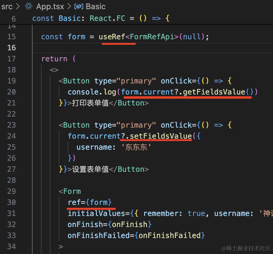 此外,我们还通过 ref 暴露出了 setFieldsValue、getFieldsValue 等 store 的 api。