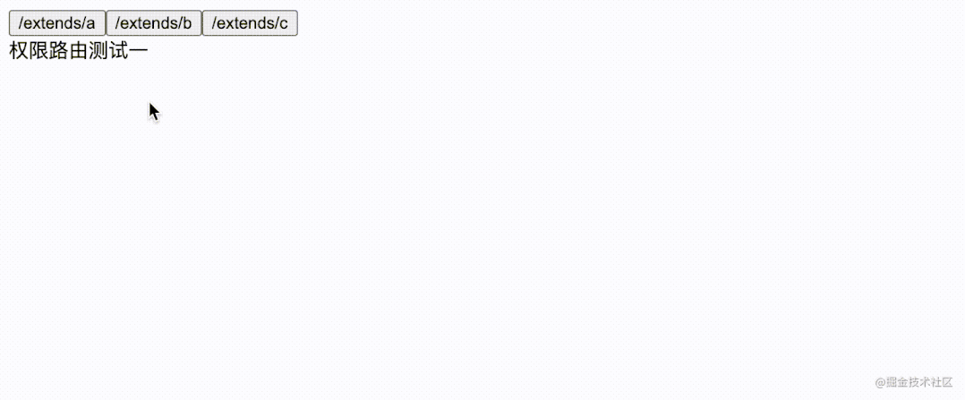 function Test1 (){ return <div>权限路由测试一</div>}function Test2 (){ return <div>权限路由测试二</div>}function Test3(){ return <div>权限路由测试三</div>}function Index({ history }){ const routerlist=[ { name:'测试一' ,path:'/extends/a' }, { name:'测试二' ,path:'/extends/b' }, { name:'测试三' ,path:'/extends/c' } ] return <div> { routerlist.map(item=> <button key={item.path} onClick={()=> history.push(item.path)} >{item.path}</button> ) } <PRoute component={Test1} path="/extends/a" /> <PRoute component={Test2} path="/extends/b" /> <PRoute component={Test3} path="/extends/c" /> </div>}效果