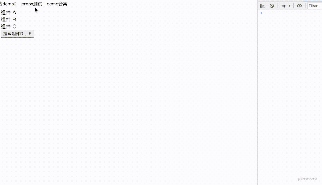 /* 创建 hoc */const loadingHoc = createHoc()function CompA(){ useEffect(()=>{ console.log('组件A挂载完成') },[]) return <div>组件 A </div>}function CompB(){ useEffect(()=>{ console.log('组件B挂载完成') },[]) return <div>组件 B </div>}function CompC(){ useEffect(()=>{ console.log('组件C挂载完成') },[]) return <div>组件 C </div>}function CompD(){ useEffect(()=>{ console.log('组件D挂载完成') },[]) return <div>组件 D </div>}function CompE(){ useEffect(()=>{ console.log('组件E挂载完成') },[]) return <div>组件 E </div>}const ComponentA = loadingHoc(CompA)const ComponentB = loadingHoc(CompB)const ComponentC = loadingHoc(CompC)const ComponentD = loadingHoc(CompD)const ComponentE = loadingHoc(CompE)export default function Index(){ const [ isShow, setIsShow ] = useState(false) return <div> <ComponentA /> <ComponentB /> <ComponentC /> {isShow && <ComponentD />} {isShow && <ComponentE />} <button onClick={()=> setIsShow(true)} > 挂载组件D ,E </button> </div>}效果: