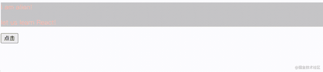 const ThemeContext = React.createContext(null) // 创建一个 context 上下文 ,主题颜色Contextfunction ConsumerDemo(){ return <div> <ThemeContext.Consumer> { (theme) => <div style={{ ...theme}} > <p>i am alien!</p> <p>let us learn React!</p> </div> } </ThemeContext.Consumer> </div>}class Index extends React.PureComponent{ render(){ return <div> <ConsumerDemo /> </div> }}export default function ProviderDemo(){ const [ theme , setTheme ]= useState({ color:'pink' , background:'#ccc' }) return <div> <ThemeContext.Provider value={theme} > <Index /> </ThemeContext.Provider> <button onClick={()=>setTheme({ color:'blue' , background:'orange' })} >点击</button> </div>}- Provider 改变,消费订阅 Provider 的 Consumer 会重新渲染。