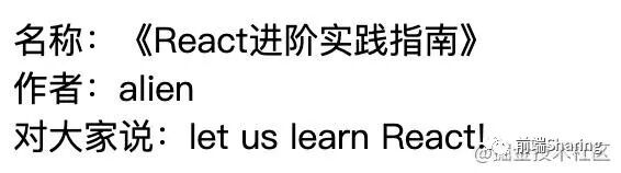 function Item (props){ return <div> 名称:{props.name} <br/> 作者:{props.author} <br/> 对大家说:{props.mes} <br/> </div>}/* 第二层组合 -> 混入 mes 属性 */function Wrap(props){ return React.cloneElement( props.children,{ mes:'let us learn React!' } )}/* 第一层组合,里面进行第二次组合,混入 author 属性 */function Groups (props){ return <Wrap> {React.cloneElement( props.children, { author:'alien' } )} </Wrap>}export default ()=>{ return <Groups> <Item name="《React进阶实践指南》" /></Groups>}- 在