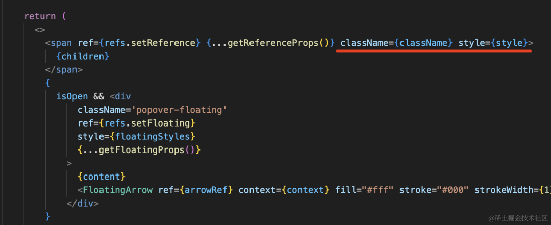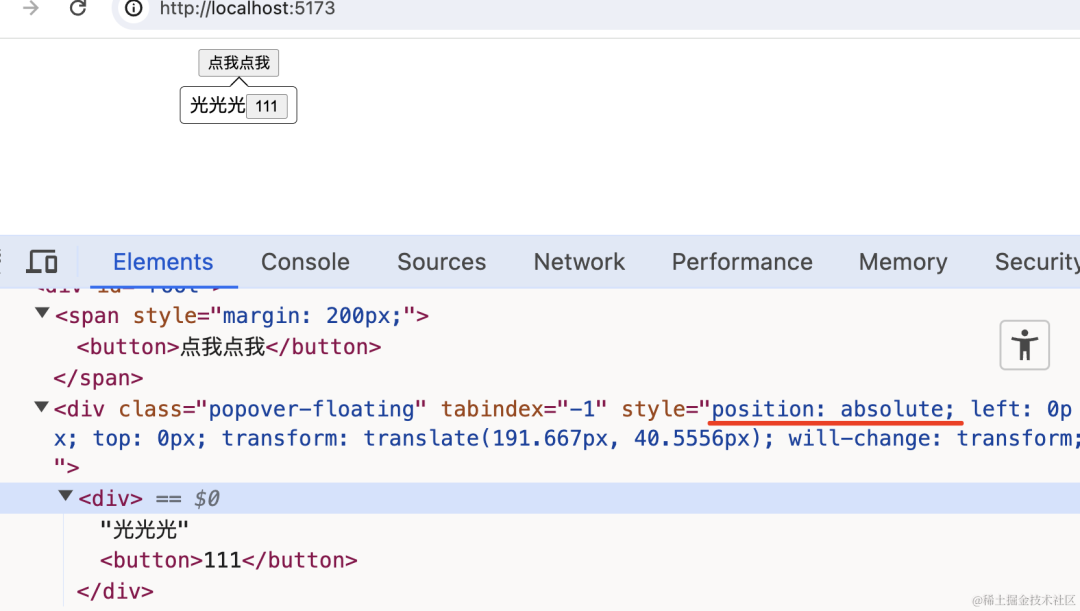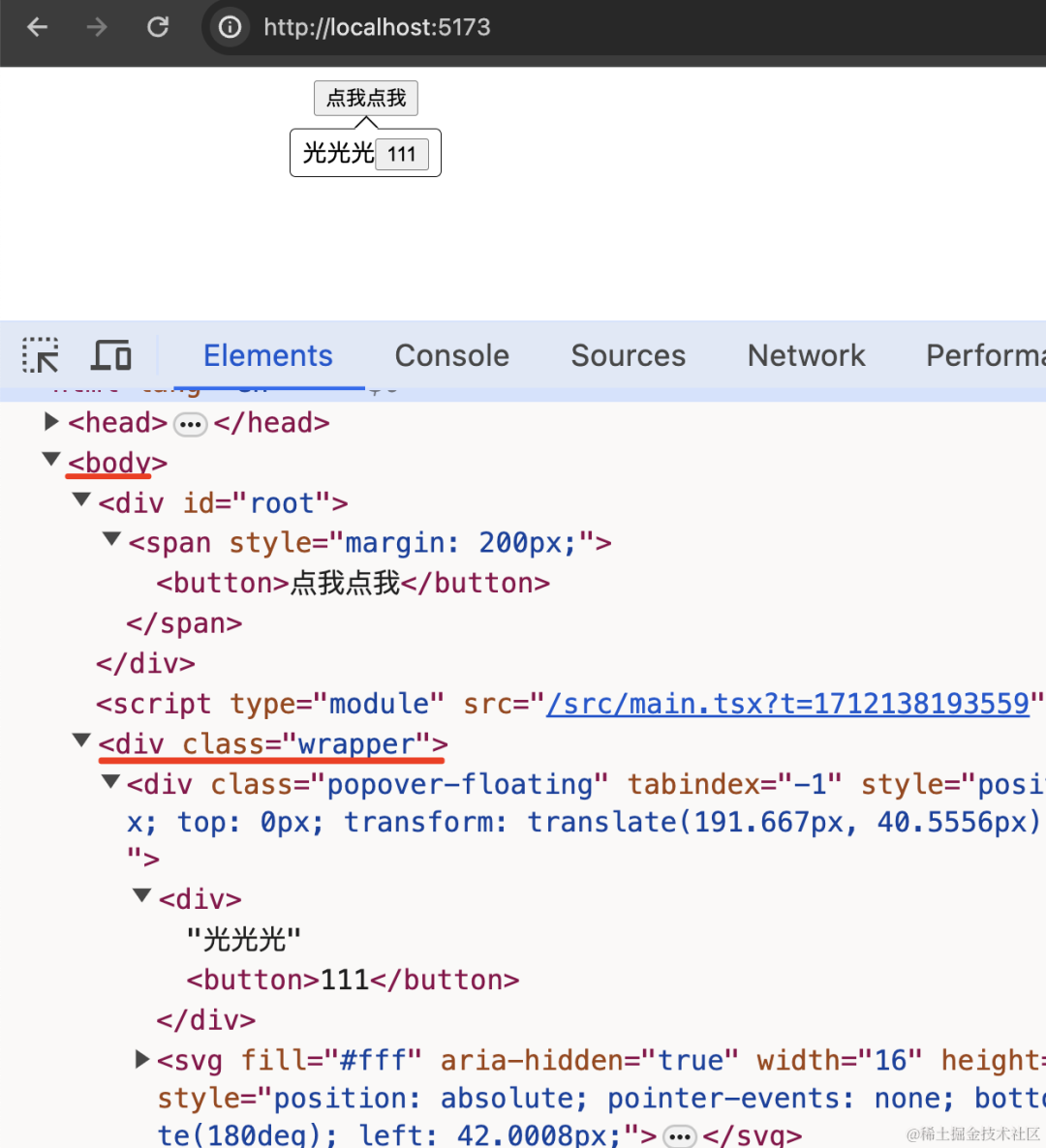 const el = useMemo(() => { const el = document.createElement('div'); el.className = `wrapper`; document.body.appendChild(el); return el;}, []);const floating = isOpen && <div className='popover-floating' ref={refs.setFloating} style={floatingStyles} {...getFloatingProps()}> {content} <FloatingArrow ref={arrowRef} context={context} fill="#fff" stroke="#000" strokeWidth={1}/></div>return ( <> <span ref={refs.setReference} {...getReferenceProps()} className={className} style={style}> {children} </span> { createPortal(floating, el) } </>);这样,Popover 浮层就渲染到了 body 下: