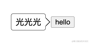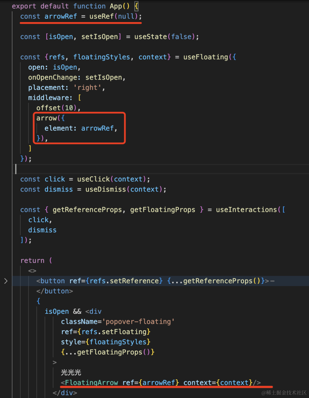 import { useInteractions, useFloating, useHover, useClick, useDismiss, offset, arrow, FloatingArrow,} from '@floating-ui/react';import { useRef, useState } from 'react';import './App.css'; export default function App() { const arrowRef = useRef(null); const [isOpen, setIsOpen] = useState(false); const {refs, floatingStyles, context} = useFloating({ open: isOpen, onOpenChange: setIsOpen, placement: 'right', middleware: [ offset(10), arrow({ element: arrowRef, }), ] }); const click = useClick(context); const dismiss = useDismiss(context); const { getReferenceProps, getFloatingProps } = useInteractions([ click, dismiss ]); return ( <> <button ref={refs.setReference} {...getReferenceProps()}> hello </button> { isOpen && <div className='popover-floating' ref={refs.setFloating} style={floatingStyles} {...getFloatingProps()} > 光光光 <FloatingArrow ref={arrowRef} context={context}/> </div> } </> );}这样箭头就有了。