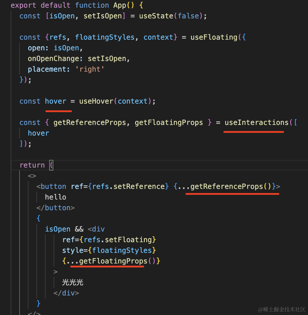 import { useInteractions, useFloating, useHover,} from '@floating-ui/react';import { useState } from 'react'; export default function App() { const [isOpen, setIsOpen] = useState(false); const {refs, floatingStyles, context} = useFloating({ open: isOpen, onOpenChange: setIsOpen }); const hover = useHover(context); const { getReferenceProps, getFloatingProps } = useInteractions([ hover ]); return ( <> <button ref={refs.setReference} {...getReferenceProps()}> hello </button> { isOpen && <div ref={refs.setFloating} style={floatingStyles} {...getFloatingProps()} > 光光光光光 </div> } </> );}先看看效果: