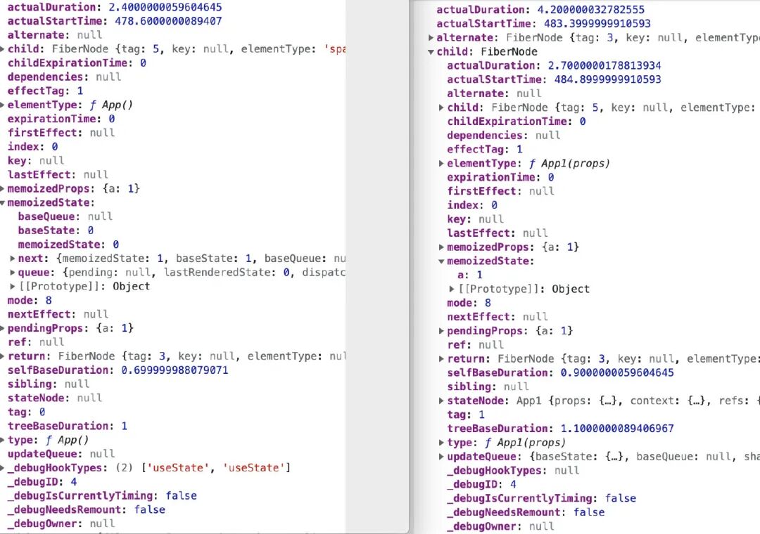众所周知,react 16 做的最大改动就是 fiber。为了适配 fiber,节点(fiber node)的数据结构做了很大的改动。修改一下 App 这个组件,在页面渲染,得到下图的 fiber node 数据结构: