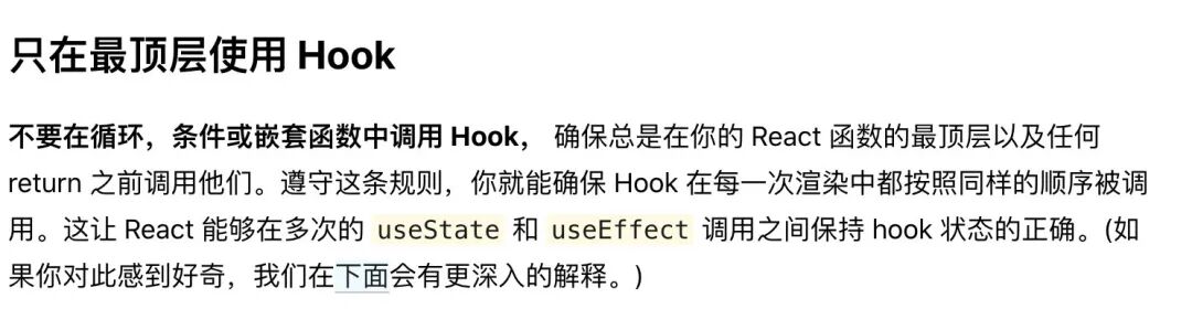 参考我们上面说的,多个 state 之间通过 next 进行关联,假设有 3 个 state,A、B、C。如果 B 在判断语句中,那么就会就会出现 A,B 的状态能够及时更新,但是 C 不会更新。因为调用 2 次 useState,只会更新两次 state,在 state 的链表中,A.next->B,B.next->C,那么就只会更新了 A、B,C 不会更新,导致一些不可预知的问题。