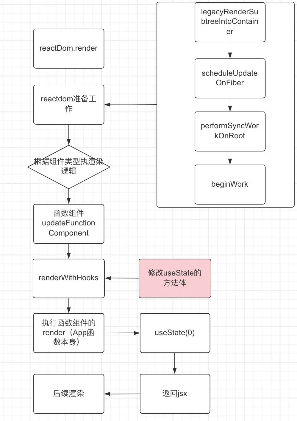 scheduleWork 会触发 react 更新,这样组件需要重新渲染。整体的流程和初次挂载的时候基本一致,但是从 mountState 方法体的实现来看,组件渲染是使用 initialState。这样肯定是有问题的。