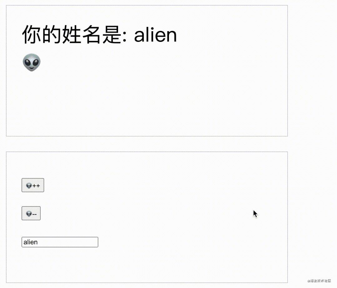 function Index(){ const state = useReactive({ number:1 , name:'alien' }) return <div class > <div> 你的姓名是: { state.name } </div> <div>{ new Array(state.number).fill(0).map(()=> '👽') }</div> </div> <div class > <div> <button onClick={ ()=> state.number++ } >👽++</button> </div> <div> <button onClick={ ()=> state.number-- } >👽--</button> </div> <input placeholder="姓名" value={state.name} onChange={ (e:any) => state.name = e.target.value } /> </div> </div>}效果