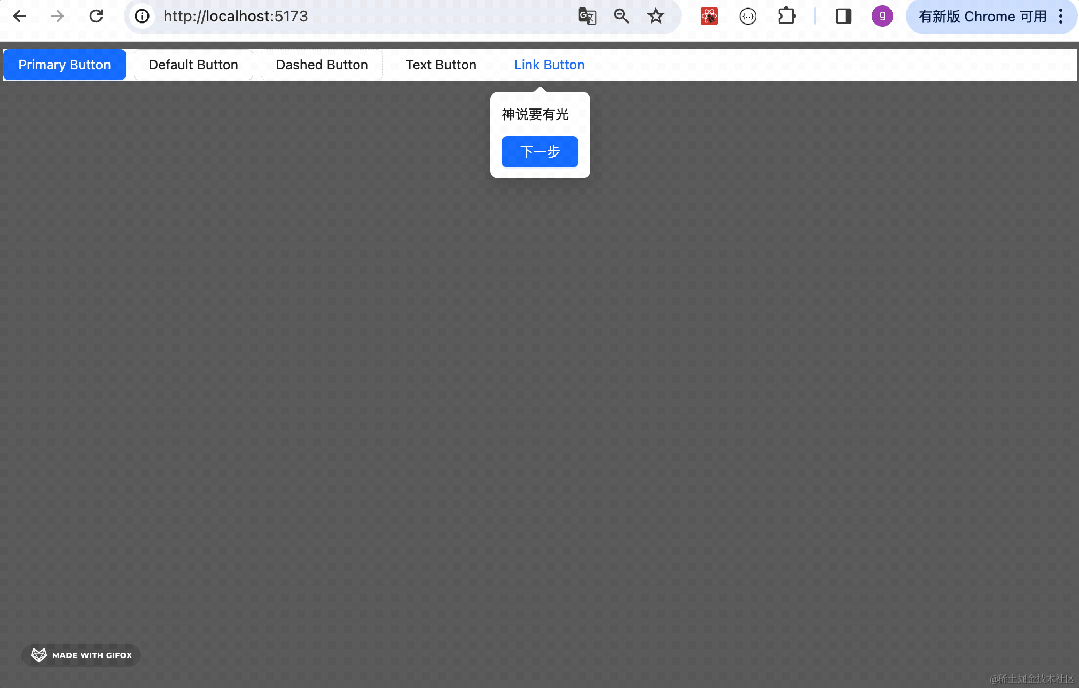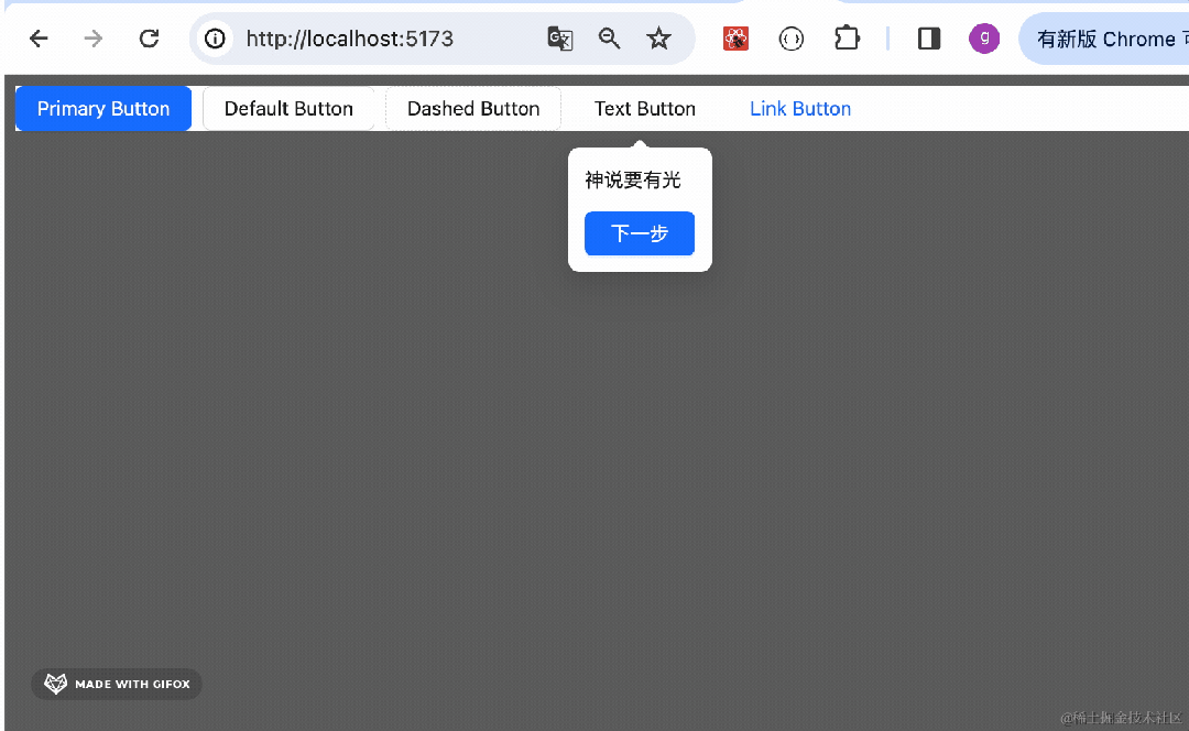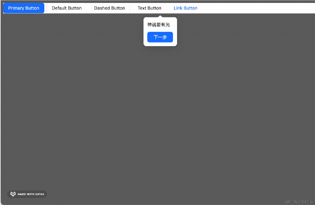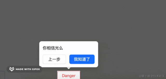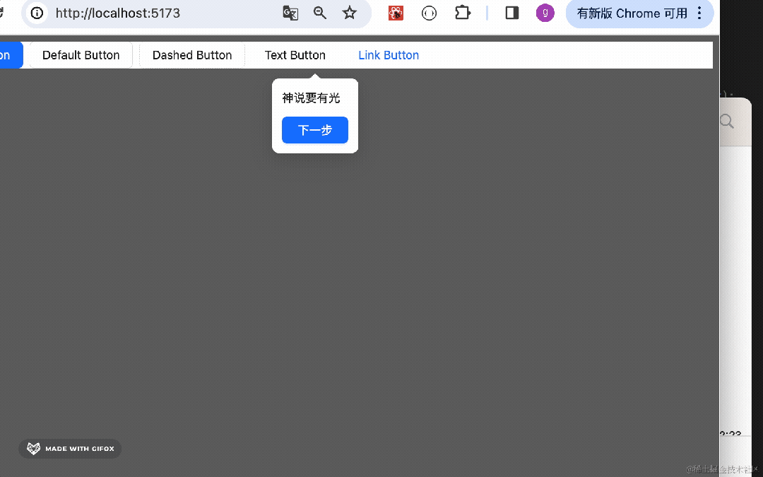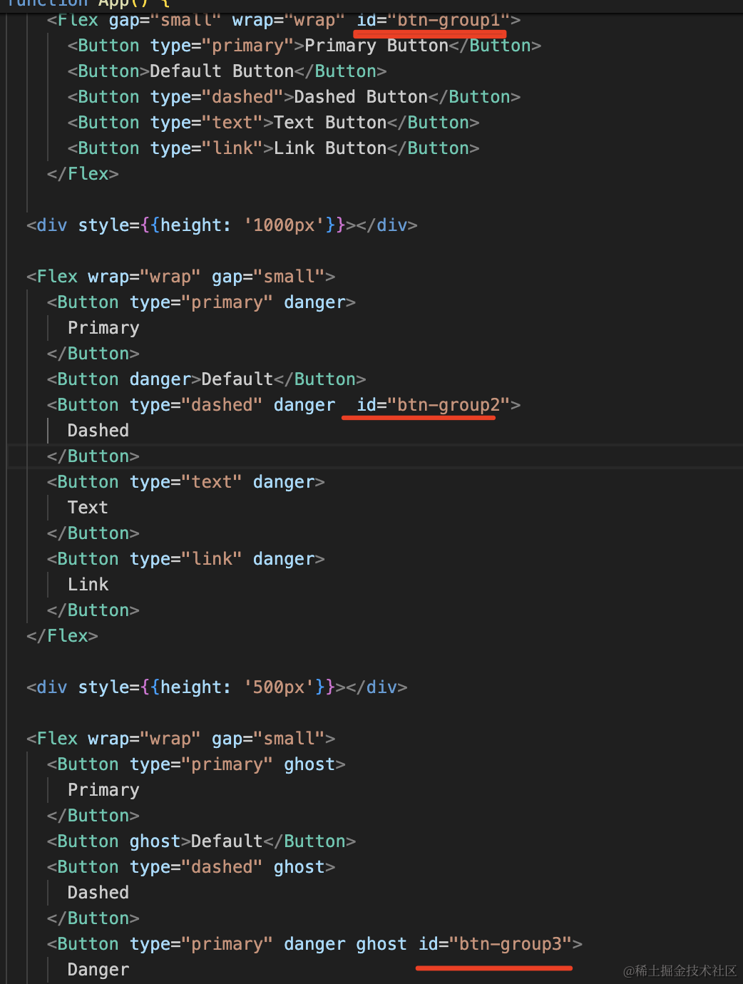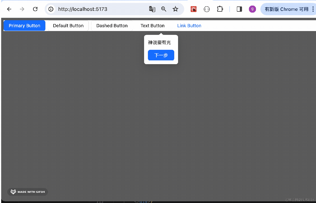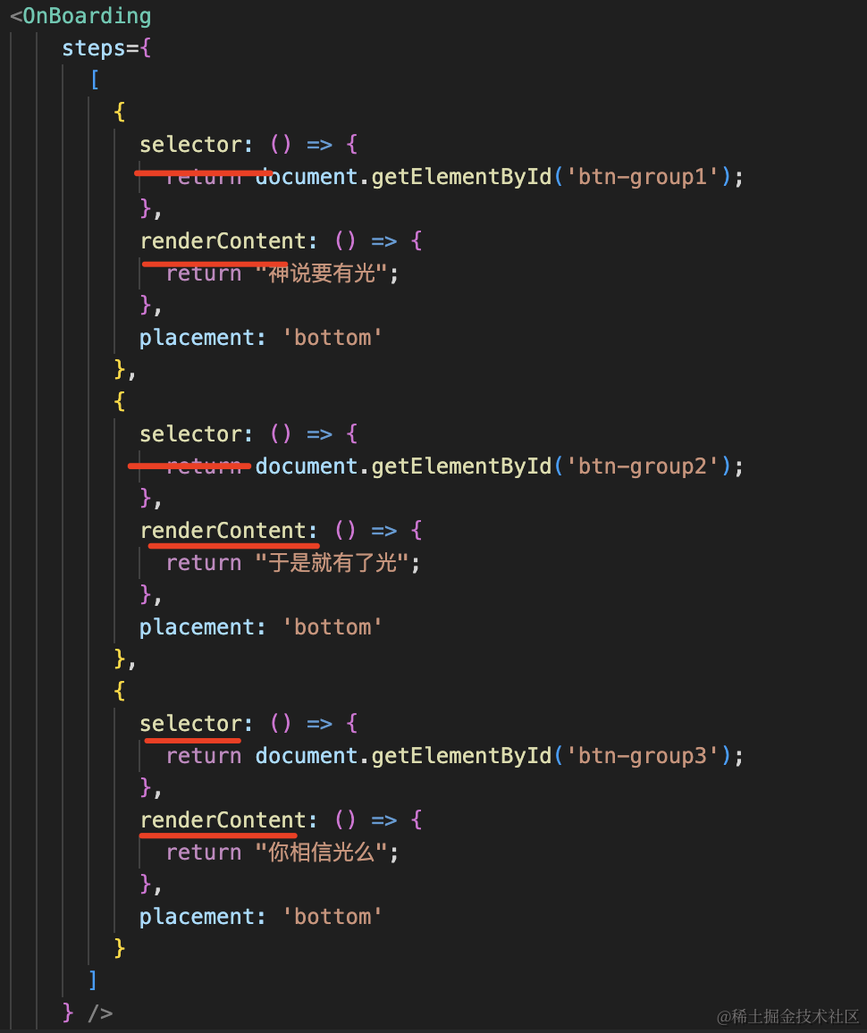 import { OnBoarding } from './OnBoarding'import { Button, Flex } from 'antd';function App() { return <div class>Link Button</Button> </Flex> <div style={{height: '1000px'}}></div> <Flex wrap="wrap" gap="small"> <Button type="primary" danger> Primary </Button> <Button danger>Default</Button> <Button type="dashed" danger id="btn-group2"> Dashed </Button> <Button type="text" danger> Text </Button> <Button type="link" danger> Link </Button> </Flex> <div style={{height: '500px'}}></div> <Flex wrap="wrap" gap="small"> <Button type="primary" ghost> Primary </Button> <Button ghost>Default</Button> <Button type="dashed" ghost> Dashed </Button> <Button type="primary" danger ghost id="btn-group3"> Danger </Button> </Flex> <OnBoarding steps={ [ { selector: () => { return document.getElementById('btn-group1'); }, renderContent: () => { return "神说要有光"; }, placement: 'bottom' }, { selector: () => { return document.getElementById('btn-group2'); }, renderContent: () => { return "于是就有了光"; }, placement: 'bottom' }, { selector: () => { return document.getElementById('btn-group3'); }, renderContent: () => { return "你相信光么"; }, placement: 'bottom' } ] } /> </div>}export default App我用 id 选中了三个元素: