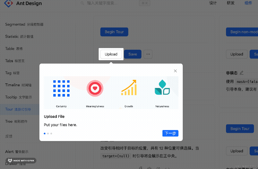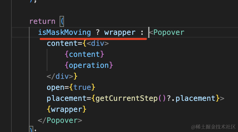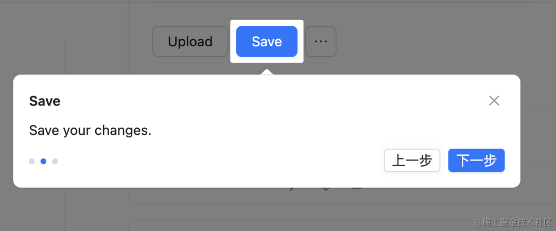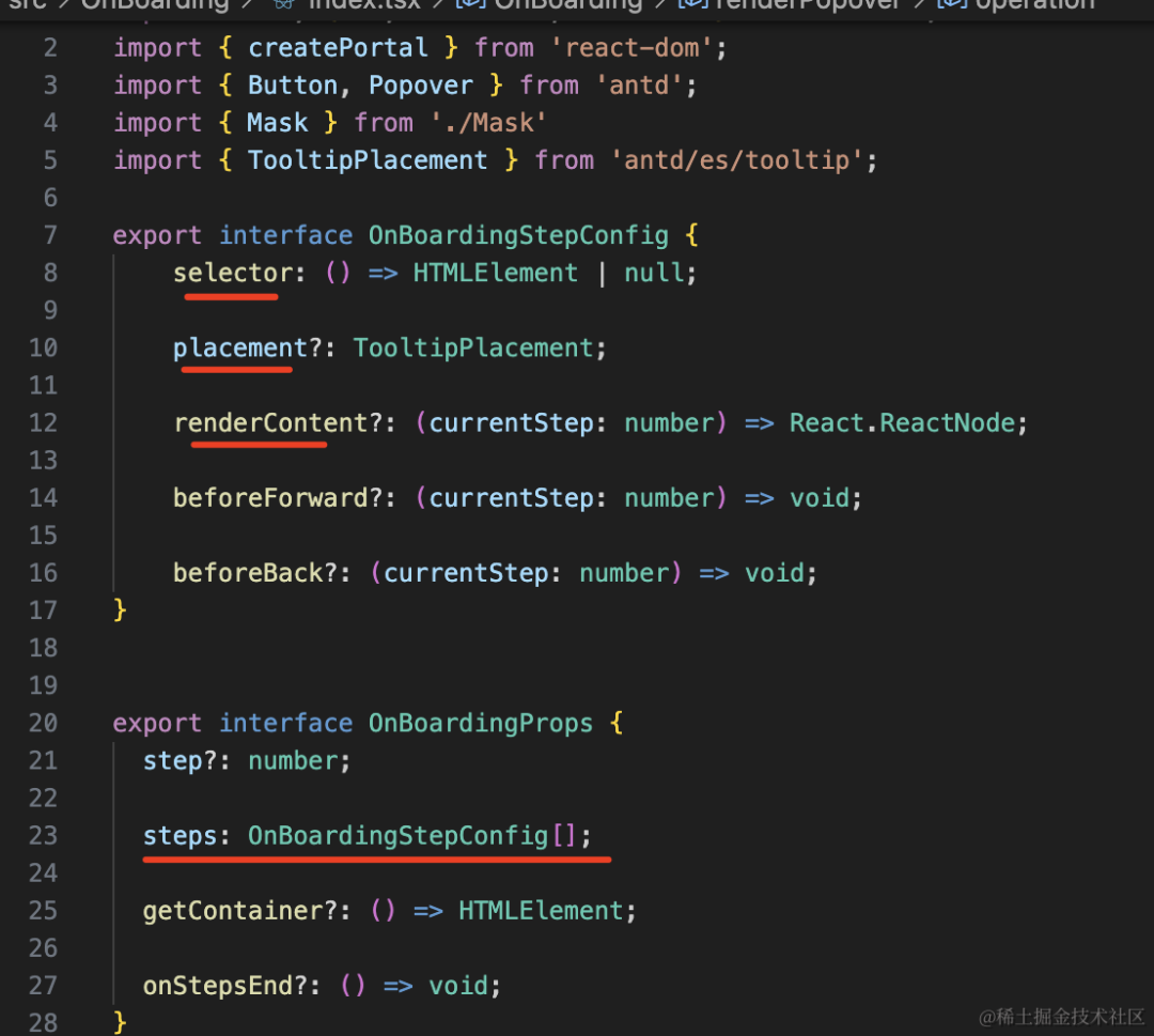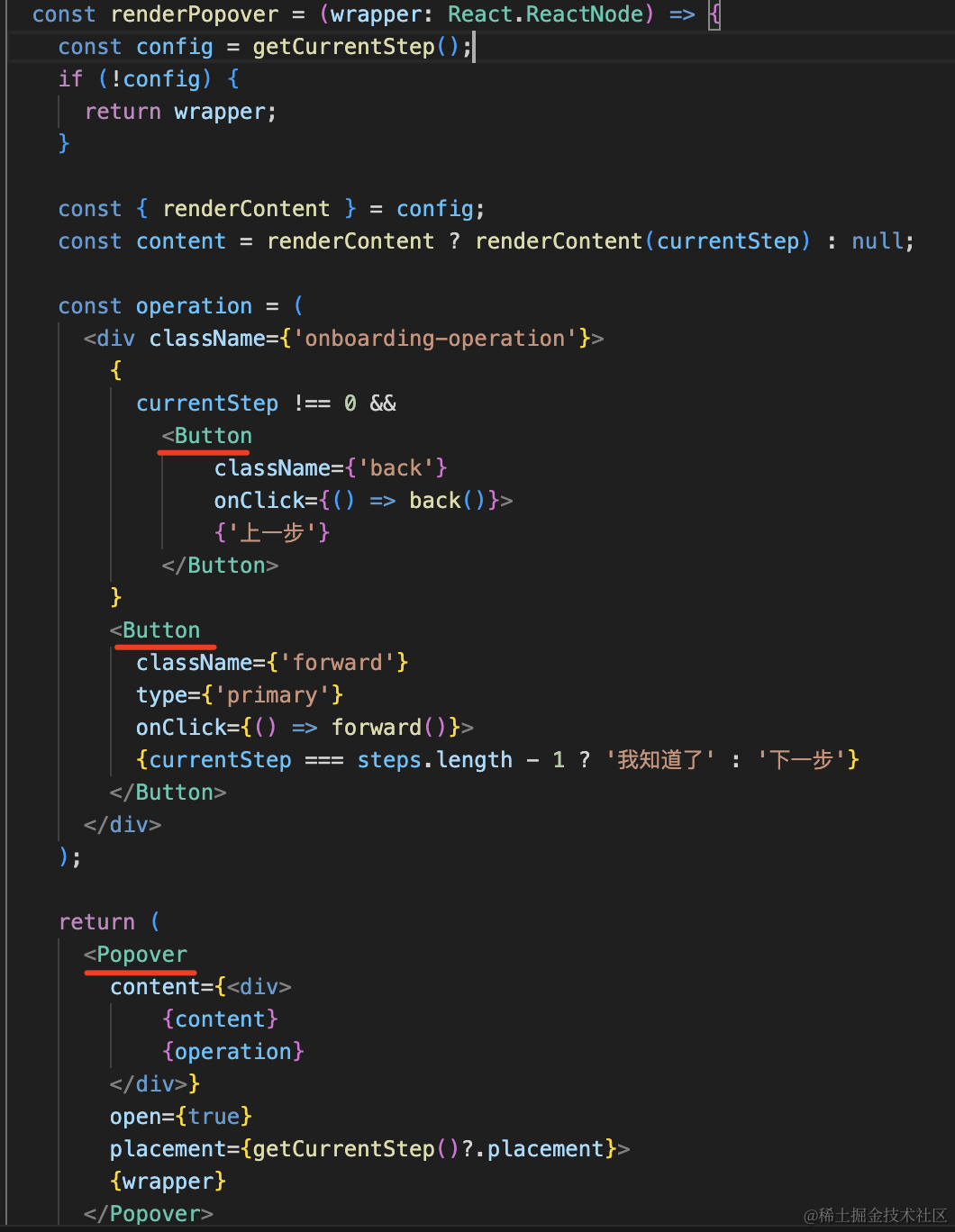 import React, { FC, useEffect, useState } from 'react';import { createPortal } from 'react-dom';import { Button, Popover } from 'antd';import { Mask } from './Mask'import { TooltipPlacement } from 'antd/es/tooltip';import './index.scss';export interface OnBoardingStepConfig { selector: () => HTMLElement | null; placement?: TooltipPlacement; renderContent?: (currentStep: number) => React.ReactNode; beforeForward?: (currentStep: number) => void; beforeBack?: (currentStep: number) => void;} export interface OnBoardingProps { step?: number; steps: OnBoardingStepConfig[]; getContainer?: () => HTMLElement; onStepsEnd?: () => void;}export const OnBoarding:FC<OnBoardingProps> = (props) => { const { step = 0, steps, onStepsEnd, getContainer } = props; const [currentStep, setCurrentStep] = useState<number>(0); const currentSelectedElement = steps[currentStep]?.selector(); const currentContainerElement = getContainer?.() || document.documentElement; const getCurrentStep = () => { return steps[currentStep]; }; const back = async () => { if (currentStep === 0) { return; } const { beforeBack } = getCurrentStep(); await beforeBack?.(currentStep); setCurrentStep(currentStep - 1); }; const forward = async () => { if (currentStep === steps.length - 1) { await onStepsEnd?.(); return; } const { beforeForward } = getCurrentStep(); await beforeForward?.(currentStep); setCurrentStep(currentStep + 1); }; useEffect(() => { setCurrentStep(step!); }, [step]); const renderPopover = (wrapper: React.ReactNode) => { const config = getCurrentStep(); if (!config) { return wrapper; } const { renderContent } = config; const content = renderContent ? renderContent(currentStep) : null; const operation = ( <div className={'onboarding-operation'}> { currentStep !== 0 && <Button className={'back'} onClick={() => back()}> {'上一步'} </Button> } <Button className={'forward'} type={'primary'} onClick={() => forward()}> {currentStep === steps.length - 1 ? '我知道了' : '下一步'} </Button> </div> ); return ( <Popover content={<div> {content} {operation} </div>} open={true} placement={getCurrentStep()?.placement}> {wrapper} </Popover> ); }; const [, setRenderTick] = useState<number>(0); useEffect(() => { setRenderTick(1) }, []); if(!currentSelectedElement) { return null; } const mask = <Mask container={currentContainerElement} element={currentSelectedElement} renderMaskContent={(wrapper) => renderPopover(wrapper)} />; return createPortal(mask, currentContainerElement);}其实这个组件主要就是切换上一步下一步用的。