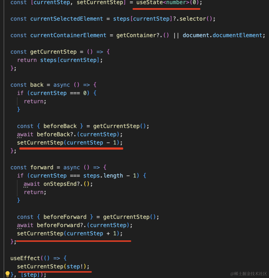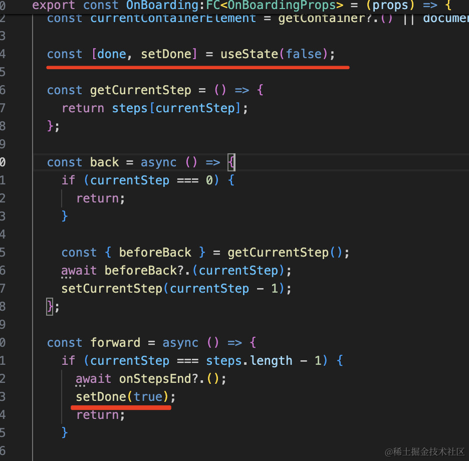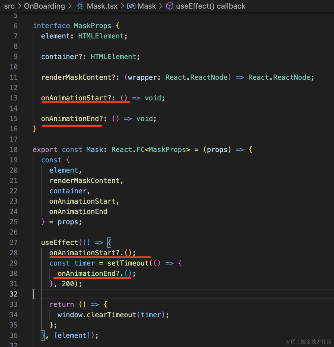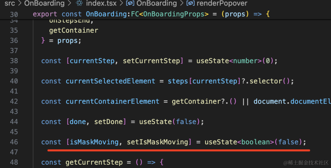 import React, { CSSProperties, useEffect, useState } from 'react';import { getMaskStyle } from './getMaskStyle'import './index.scss';interface MaskProps { element: HTMLElement; container?: HTMLElement; renderMaskContent?: (wrapper: React.ReactNode) => React.ReactNode; onAnimationStart?: () => void; onAnimationEnd?: () => void;}export const Mask: React.FC<MaskProps> = (props) => { const { element, renderMaskContent, container, onAnimationStart, onAnimationEnd } = props; useEffect(() => { onAnimationStart?.(); const timer = setTimeout(() => { onAnimationEnd?.(); }, 200); return () => { window.clearTimeout(timer); }; }, [element]); const [style, setStyle] = useState<CSSProperties>({}); useEffect(() => { const observer = new ResizeObserver(() => { const style = getMaskStyle(element, container || document.documentElement); setStyle(style); }); observer.observe(container || document.documentElement); }, []); useEffect(() => { if (!element) { return; } element.scrollIntoView({ block: 'center', inline: 'center' }); const style = getMaskStyle(element, container || document.documentElement); setStyle(style); }, [element, container]); const getContent = () => { if (!renderMaskContent) { return null; } return renderMaskContent( <div className={'mask-content'} style={{ width: '100%', height: '100%' }} /> ); }; return ( <div style={style} className='mask'> {getContent()} </div> );};然后在 OnBoarding 组件加一个 state: