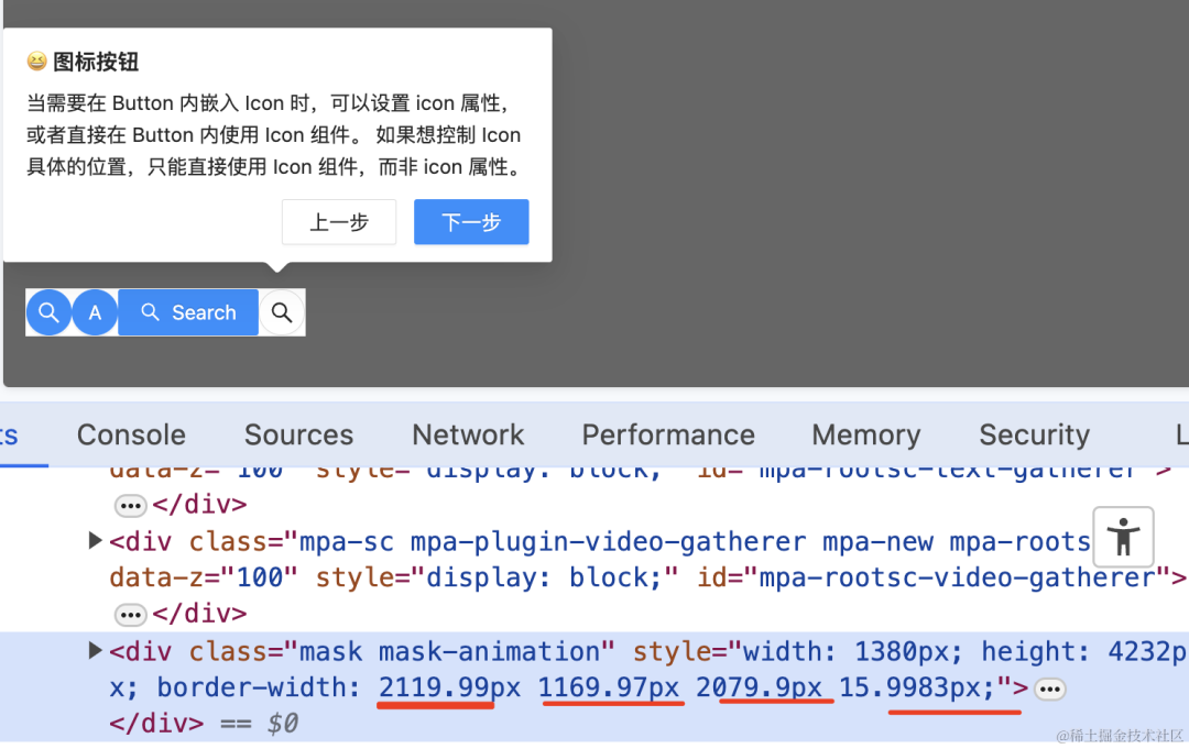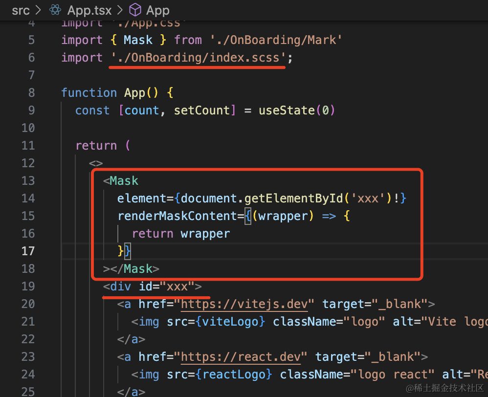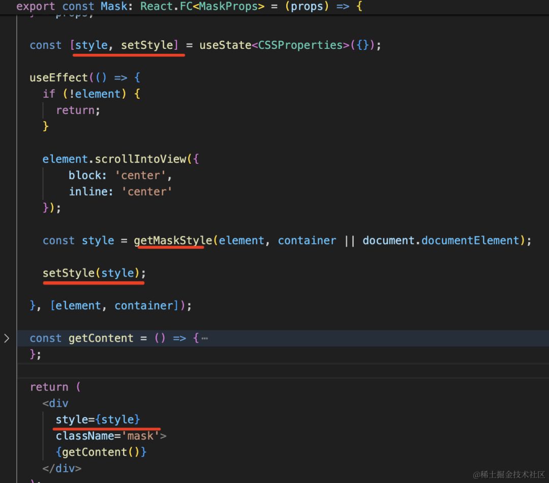 import React, { CSSProperties, useEffect, useState } from 'react';import { getMaskStyle } from './getMaskStyle'interface MaskProps { element: HTMLElement; container?: HTMLElement; renderMaskContent?: (wrapper: React.ReactNode) => React.ReactNode;}export const Mask: React.FC<MaskProps> = (props) => { const { element, renderMaskContent, container } = props; const [style, setStyle] = useState<CSSProperties>({}); useEffect(() => { if (!element) { return; } element.scrollIntoView({ block: 'center', inline: 'center' }); const style = getMaskStyle(element, container || document.documentElement); setStyle(style); }, [element, container]); const getContent = () => { if (!renderMaskContent) { return null; } return renderMaskContent( <div className={'mask-content'} style={{ width: '100%', height: '100%' }} /> ); }; return ( <div style={style} className='mask'> {getContent()} </div> );};这里传入的 element、container 分别是目标元素、遮罩层所在的容器。