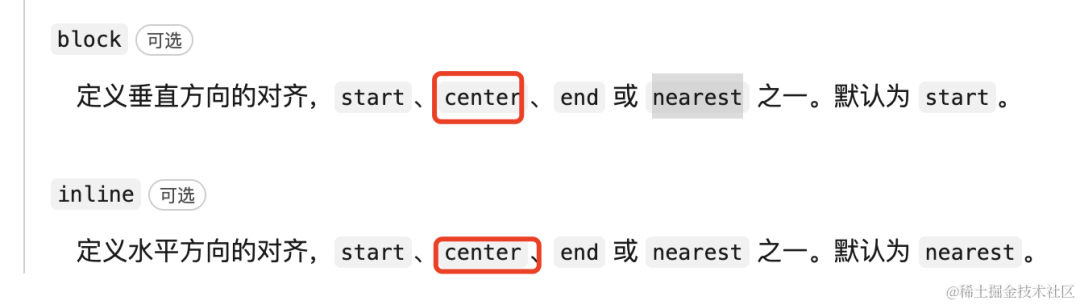 设置 block、inline 为 center 是把元素中心滚动到可视区域中心的意思:
