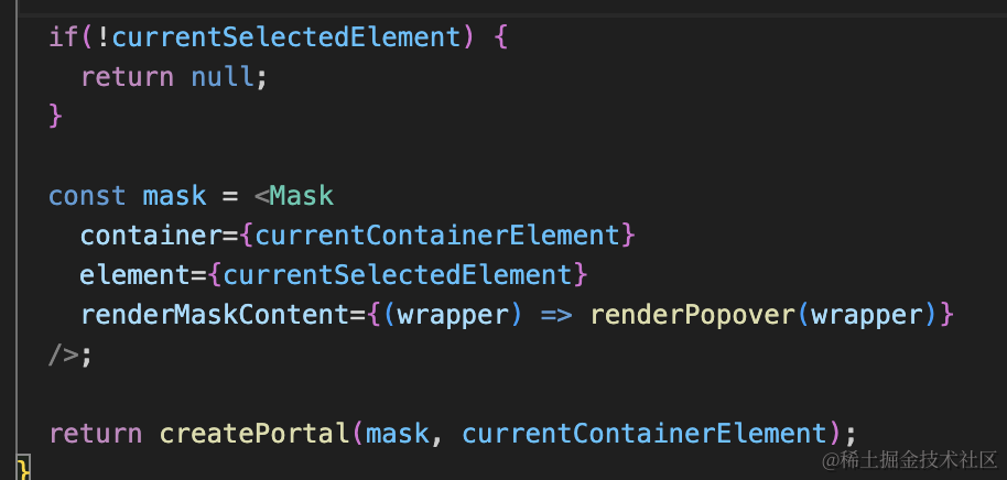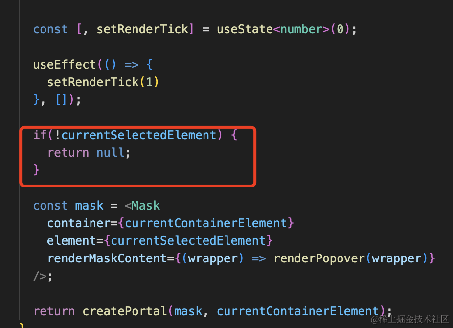 第一次渲染的时候,元素是 null,触发重新渲染之后,就会渲染下面的 Mask 了: