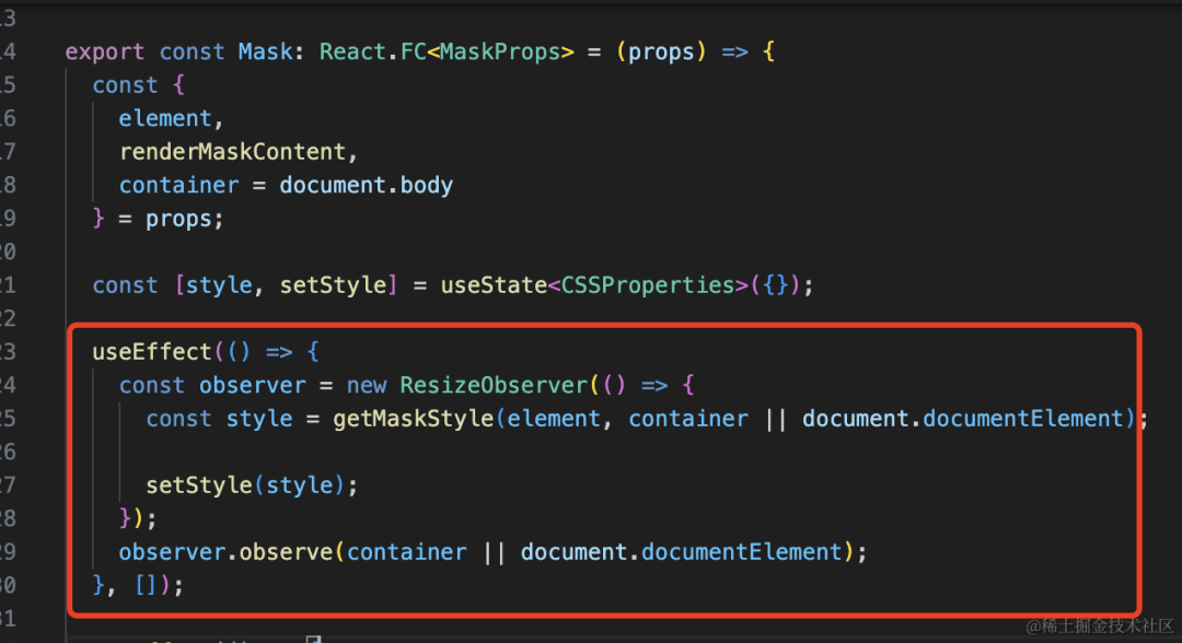 useEffect(() => { const observer = new ResizeObserver(() => { const style = getMaskStyle(element, container || document.documentElement); setStyle(style); }); observer.observe(container || document.documentElement);}, []);变了重新计算和设置 mask 的 style。