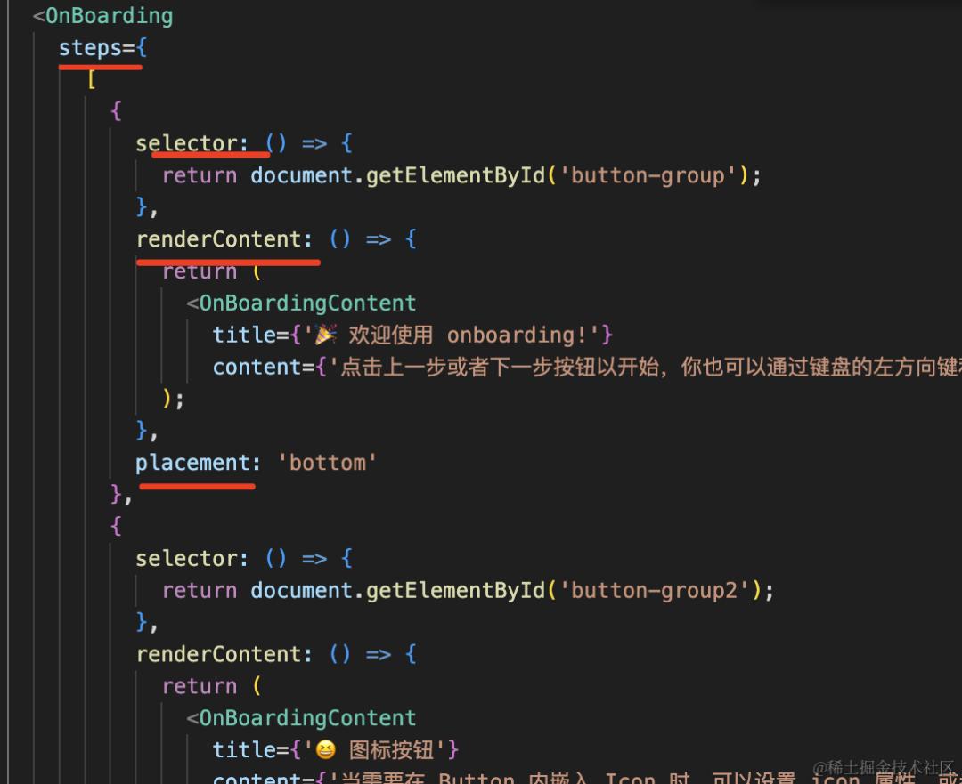 传入 steps,包含每一步在哪个元素(selector),显示什么内容(renderConent),在什么方位(placement)。