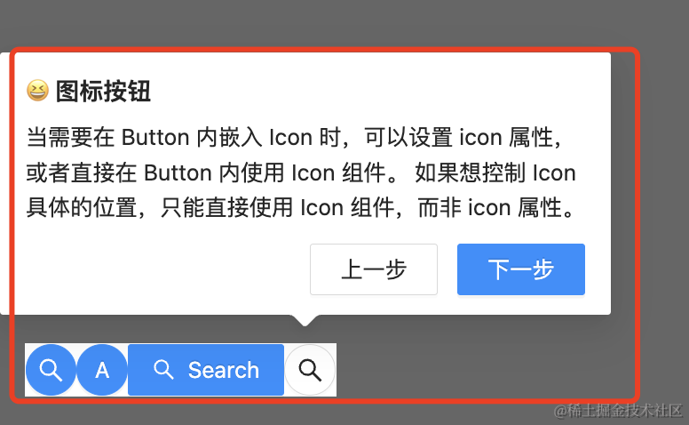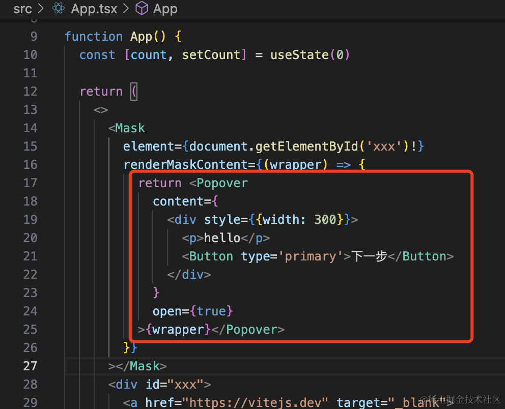 <Mask element={document.getElementById('xxx')!} renderMaskContent={(wrapper) => { return <Popover content={ <div style={{width: 300}}> <p>hello</p> <Button type='primary'>下一步</Button> </div> } open={true} >{wrapper}</Popover> }}></Mask>没啥问题。
