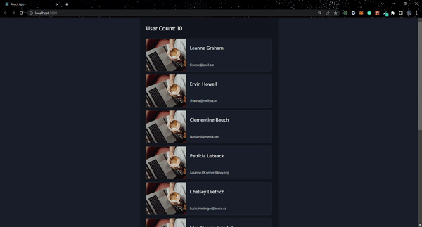 import React, { useEffect, useState } from "react";import { Box, Card, CardBody, CardFooter, Image, Stack, Text,} from "@chakra-ui/react";import { useGlobalState } from "./store";const App = () => { const state = useGlobalState(); const [user, setUser] = useState([]); useEffect(() => { state.getUsers(); // eslint-disable-next-line react-hooks/exhaustive-deps }, []); useEffect(() => { if (state.loading().value === true) { setUser(state.fetchUsers()); } }, [state]); return ( <Box display="flex" flexDirection="column" justifyContent="flex-start" alignItems="center" maxW="1440px" minH="100vh" m="auto" > <Box width={{ base: "auto", md: "700px" }} minH="100vh" mt="0rem" bg={{ base: "transparent", md: "blackAlpha.400" }} p={8} > <Text fontSize="28px" fontWeight="600" mb={4}> User Count: {user.length} </Text> <Box my={8}> {user.length < 1 && ( <Text py={4} textAlign="center"> No user post found </Text> )} {user && user.map((item, index) => ( <Card key={index} direction={{ base: "column", sm: "row" }} overflow="hidden" variant="outline" my={4} > <Image objectFit="cover" maxW={{ base: "100%", sm: "200px" }} src="https://images.unsplash.com/photo-1667489022797-ab608913feeb?ixlib=rb-4.0.3&ixid=MnwxMjA3fDB8MHxlZGl0b3JpYWwtZmVlZHw5fHx8ZW58MHx8fHw%3D&auto=format&fit=crop&w=800&q=60" alt="Caffe Latte" /> <Stack w="full"> <CardBody> <Text fontSize="24px" fontWeight="600" py="2"> {item.value.name} </Text> </CardBody> <CardFooter display="flex" justifyContent="flex-start" gap={4} > <Text>{item.value.email}</Text> </CardFooter> </Stack> </Card> ))} </Box> </Box> </Box> );};export default App;和前面一样, getUsers 从全局状态初始化函数并将数据加载到用户中,然后 fetchUsers 仅当 loading 设置为 true 时才能成功检索用户列表。接下来,我们映射来自状态的数据 user 并使用 item.value.name 和 item.value.email 来获取每个项目的值。