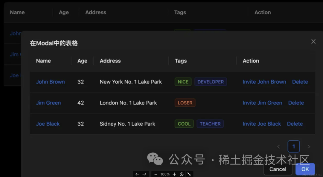可以看到由于暗色模式下 Modal 的底色与页面基础的 Layout 底色不同,最终呈现的感觉就是 table “陷” 进去了一层,但这种场景在 antd 层面往往无能为力,因为组件本身并不限制业务应用如何使用组件,因此就需要开发者自己去做样式覆盖。这篇文档中官方提供了很多关于灵活性讲解的例子。