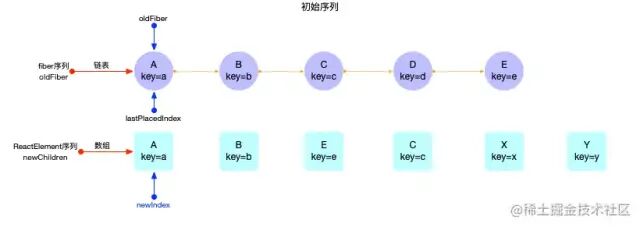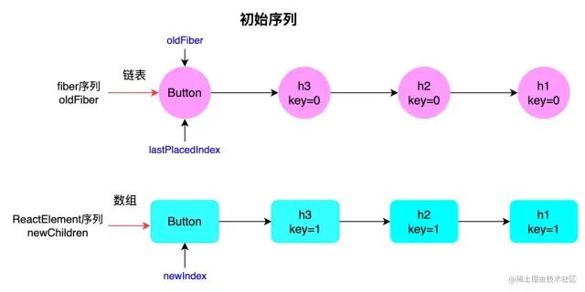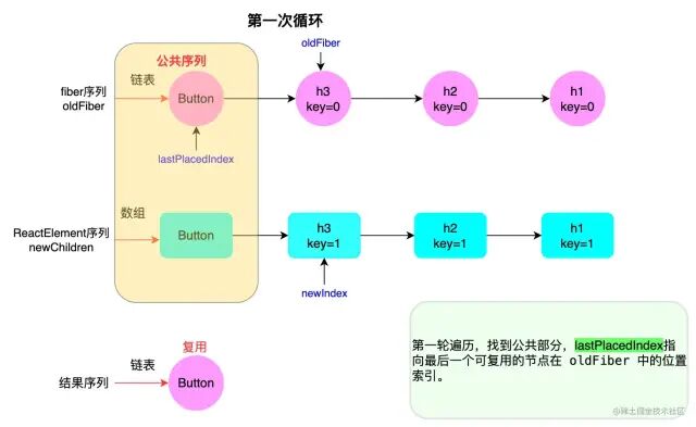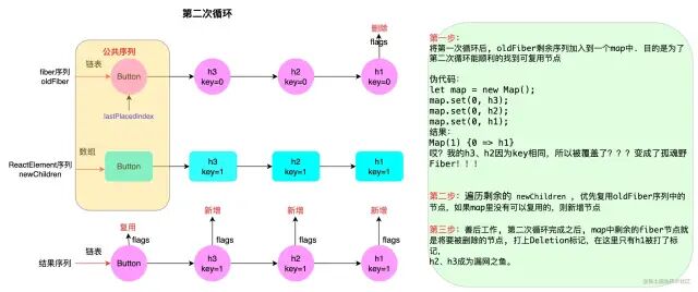 newChildren与oldFiber都没遍历完(重点)源码 [7]- 先去`声明map数据结构`,遍历一遍老节点,把老fiber的key做映射 \{元素的key:老的fiber节点\}, - 继续遍历新`jsx`,如果`map`有`key`,会把`key`从`map`中删除,说明可以复用,把当前节点标记为`更新`。新地位高的不动,新地位低的动(中间插入链表比链表屁股插入费劲)所以地位低的动动。 - `lastPlaceIndex`指针,指向最后一个不需要动的老节点的`key`。每次新jsx复用到节点,`lastPlaceIndex`会指向老节点的最后一个成功复用的老`fiber`节点。如果新复用的节点key小于`lastPlaceIndex`,说明老`fiber`节点的顺序在新`jsx`之前,需要挪动位置接到新`jsx`节点后面。 - 如果`jsx`没有复用的老`fiber`,直接插入新的 - `map`中只剩还没被复用的节点,等着新的`jsx`数组遍历完,`map`里面的`fiber`节点全部设置为删除