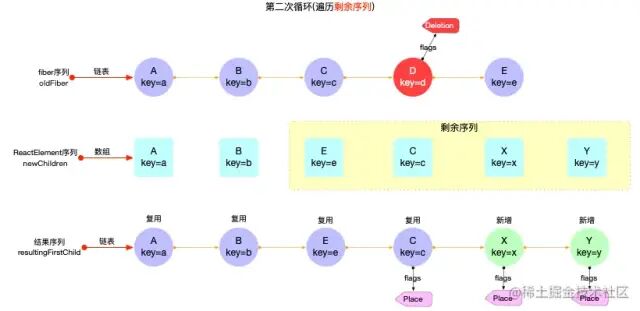 key不同导致不可复用,立即跳出整个遍历,第一轮遍历结束。key相同type不同导致不可复用,会将oldFiber标记为DELETION,并继续遍历