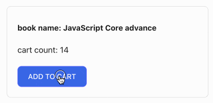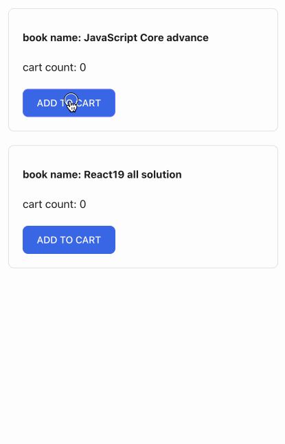 function Index() { const [carts, setCarts] = useState([]) function addToCart(item) { const targetItem = carts.find((cart) => cart.id === item.id) if (targetItem) { targetItem.count += 1 setCarts([...carts]) return } setCarts(carts => [...carts, item]) } return ( <div> <BookItem id='001' title='JavaScript Core advance' onSubmit={addToCart} /> <BookItem id='002' title='React19 all solution' onSubmit={addToCart} /> <CartList cart={carts} /> </div> )}export default Indeximport c from './cart.module.css'function CartList({cart = []}) { return ( <div> {cart.map((item, index) => ( <div id={c.inner} key={`cart_${index}`}> <div>title: {item.title}</div> <div>id: {item.id}</div> <div>count: {item.count || 0}</div> </div> ))} </div> )}export default CartList然后回到 BookItem 组件。我们补全 useActionState 的逻辑
