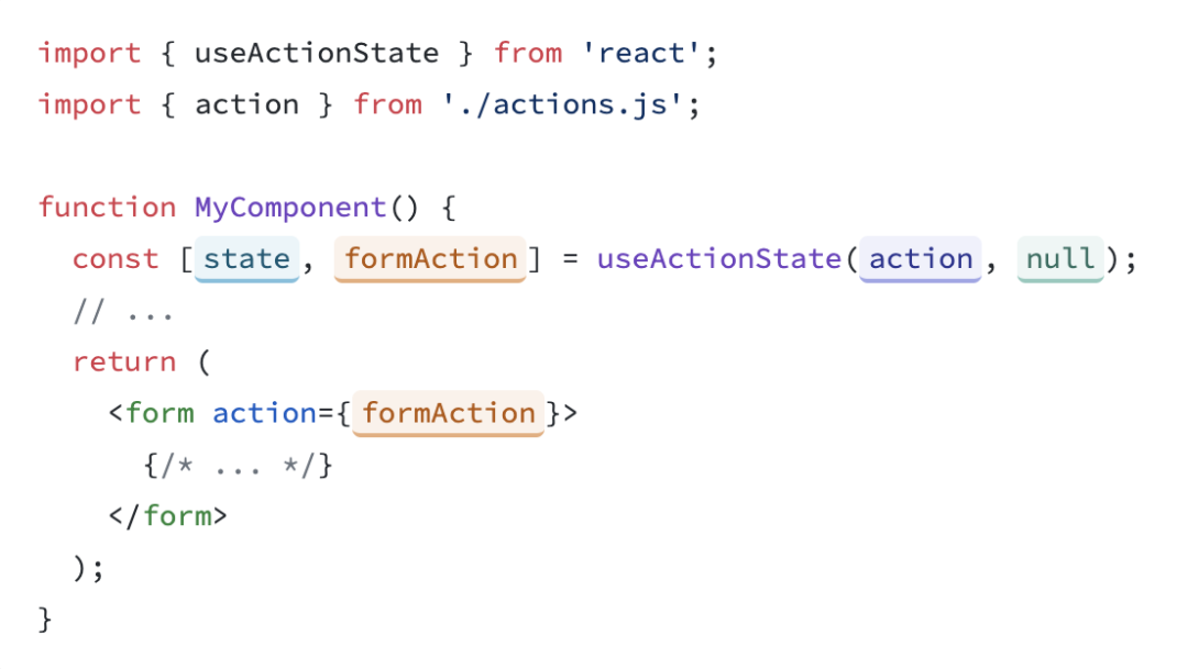 import { useActionState } from "react";async function increment(cur, formData) { return cur + 1;}function StatefulForm({}) { const [state, formAction] = useActionState(increment, 0); return ( <form> {state} <button formAction={formAction}> Increment </button> </form> )}2