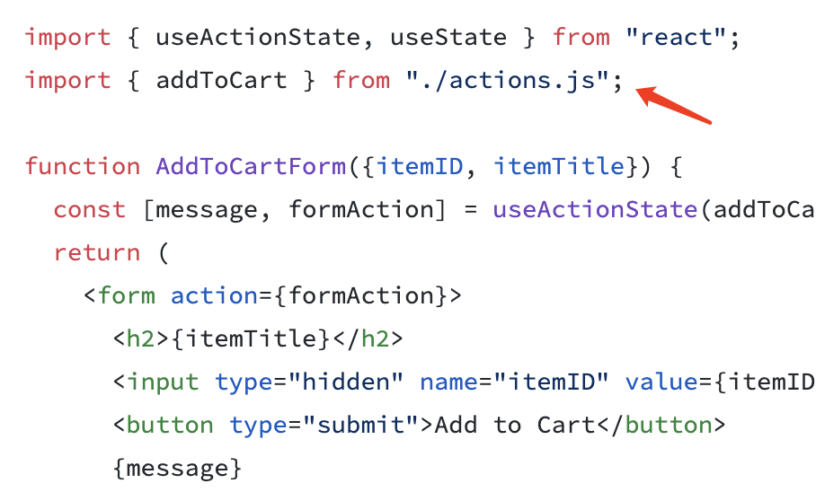 import { useActionState } from "react";async function increment(previousState, formData) { return previousState + 1;}function StatefulForm({}) { const [state, formAction] = useActionState(increment, 0); return ( <form> {state} <button formAction={formAction}>Increment</button> </form> )}我发现,increment 的声明是写在函数组件之外的。这一刻我仿佛抓住了什么。于是我又查看了别的几个案例,发现确实是如此
