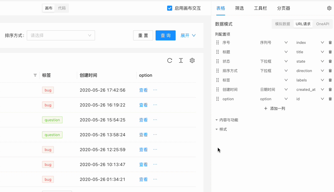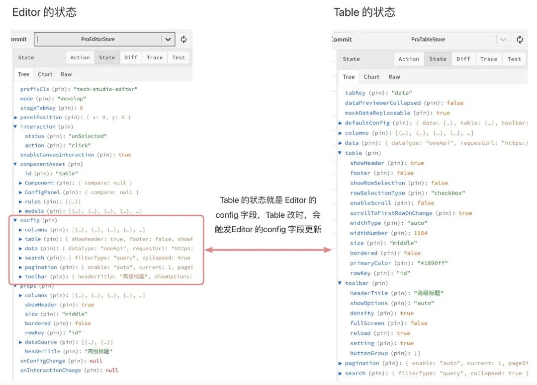 从上图可以看到,Table 的状态就是 Editor 的 config 字段,当 Table 改时,会触发 Editor 的 config 字段同步更新。当 Editor 更新时,也会触发该数据更新。