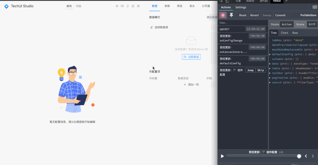 // devtools 中间件// store 逻辑const vanillaStore = (set,get)=> ({ syncOutSource: (nextState) => { set({ ...get(), ...nextState }, false, `受控更新:${Object.keys(nextState).join(' ')}`); }, syncOutSourceConfig: ({ config }) => { // ... set({ ...get(), ...config }, false, `受控更新:🛠 组件配置`); // ... },}); const createStore = create( devtools(vanillaStore, { name: 'ProTableStore' }));然后我们就可以在 redux-devtools 中愉快地查看数据变更了: