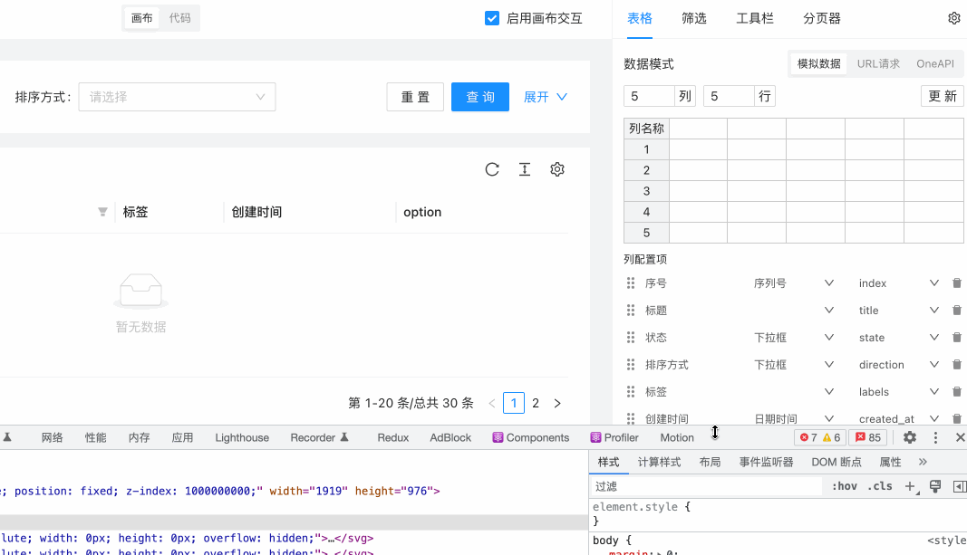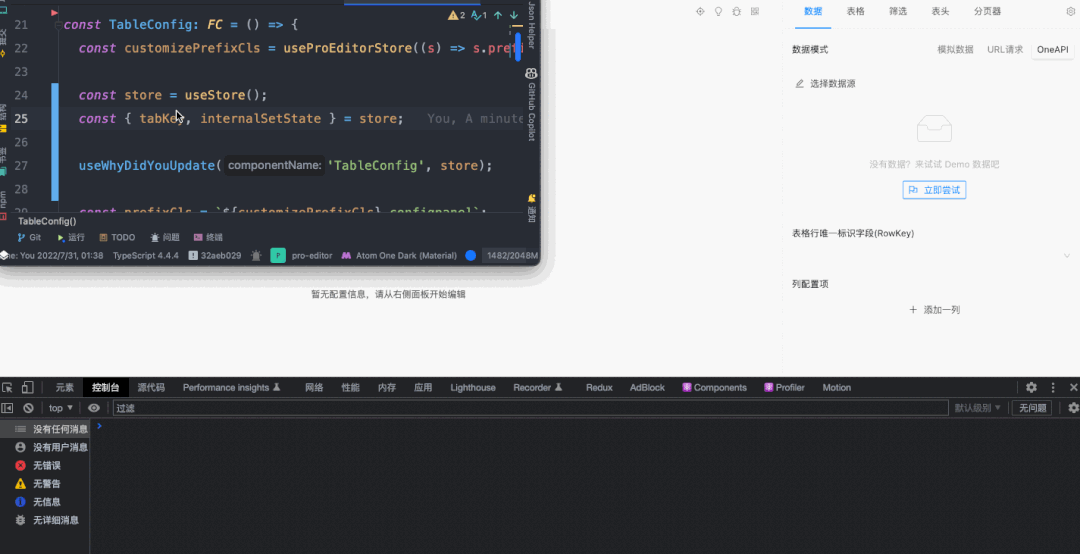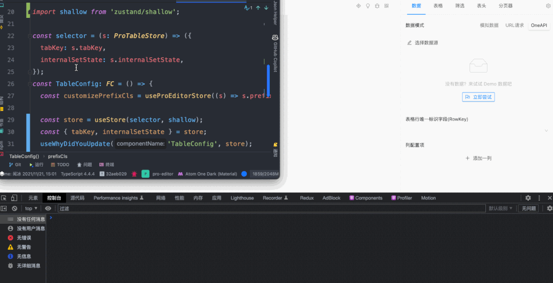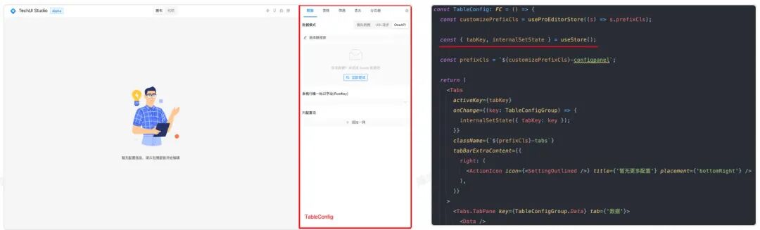 比如 ProEditor 中一个叫 TableConfig 的面板组件,对应的左下图中圈起来的部分。而右下图则是相应的代码,可以看到这个组件从 useStore 中 解构了 tabKey 和 internalSetState 的方法。