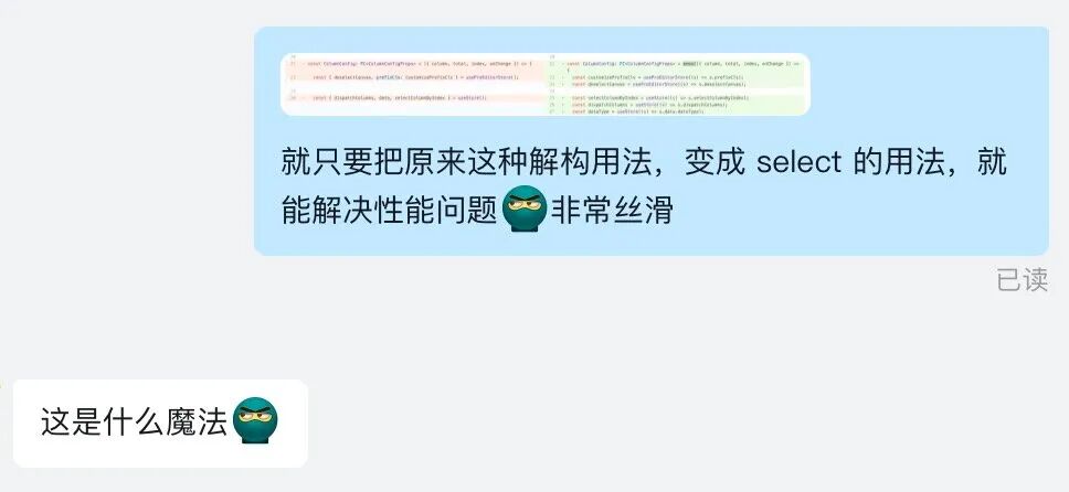 在裸 hooks 的状态管理下,要做性能优化得专门起一个专项来分析与实施。但基于 zustand 的 useStore 和 selector 用法,我们可以实现低成本、渐进式的性能优化。