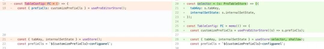 // 性能优化方法import shallow from 'zustand/shallow'; // zustand 提供的内置浅比较方法import { useStore, ProTableStore } from './store'const selector = (s: ProTableStore) => ({ tabKey: s.tabKey, internalSetState: s.internalSetState,});const TableConfig: FC = () => { const { tabKey, internalSetState } = useStore(selector, shallow);}这样一来,TableConfig 的性能优化就做好了~