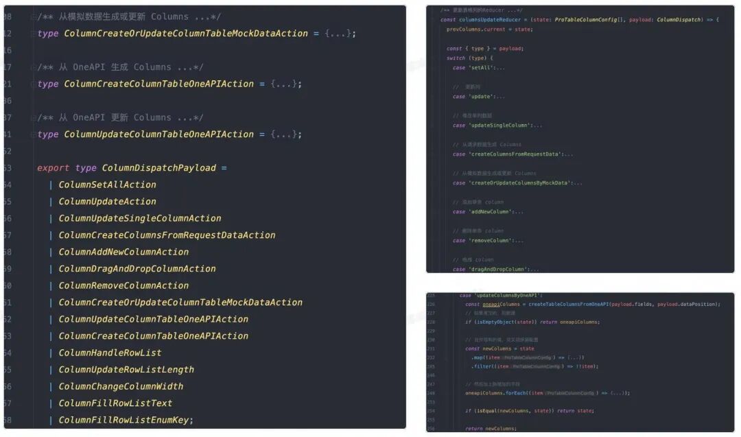 ProEditor 针对表格编辑,做了大量的数据变换操作。比如 ProTable 中针对 columns 这个字段的更新就有 14 种操作。比如其中一个比较容易被感知的updateColumnByOneAPI 就是基于 oneAPI 的字段信息更新,细颗粒度地调整 columns 里的字段信息。而这样的字段修改类型的 store,在 ProEditor 中除了 columns 还有一个 data。