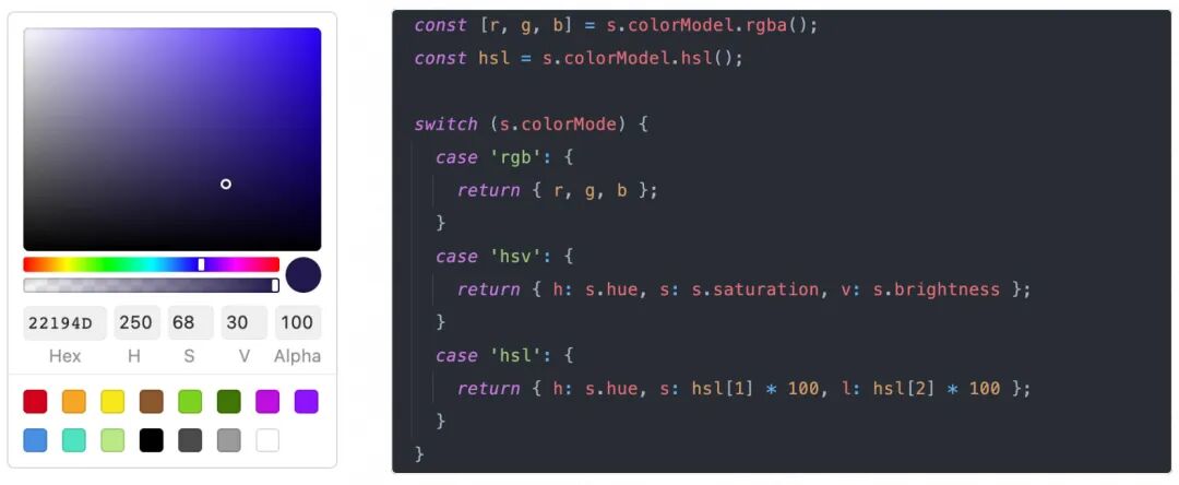 复杂的例子,比如基于 rgb 、hsl 值和色彩模式,得到一个包含色彩空间的对象。
