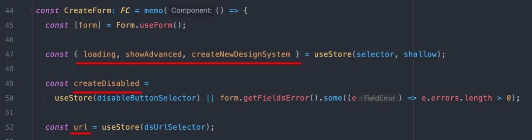 // zustand store 写法// store.tsimport create from 'zustand';const initialState = { // ...};export const useStore = create((set, get) => ({ ...initialState, createNewDesignSystem: async () => { const { params, toggleLoading } = get(); toggleLoading(); const res = await dispatch('/hitu/remote/create-new-ds', params); toggleLoading(); if (!res) return; set({ created: true, designId: res.id }); }, toggleLoading: () => { set({ loading: !get().loading }); }}));// CreateForm.tsximport { useStore } from './store';const CreateForm: FC = () => { const { createNewDesignSystem } = useStore(); // ...}另外一个让人非常舒心的点在于,zustand 会默认将所有的函数保持同一引用。所以用 zustand 写的方法,默认都不会造成额外的重复渲染。(PS:这里再顺带吹一下 WebStorm 对于函数和变量的识别能力,非常好用)