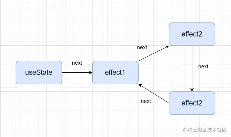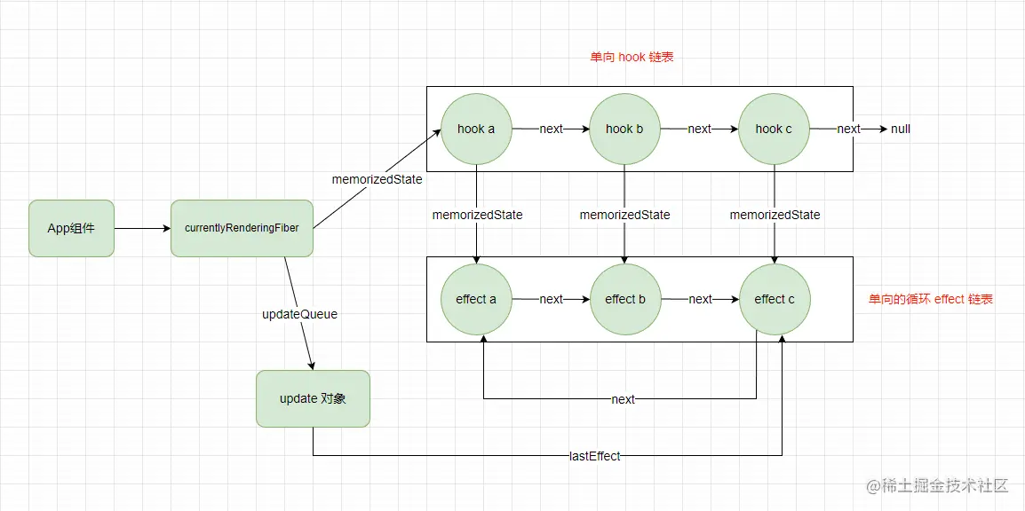 在之前的一篇文章中就已经讲解到, 对于函数组件来说, 其 fiber 上的 memorizedState 专门用来存储 hooks 链表, 每一个 hook 对应链表中的每一个元素, 最终与其他的 effect 链表形成环形链表。