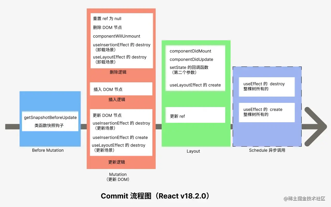 - commit(提交) 阶段: 异步调度 useEffect,layout(布局) 阶段同步处理 useLayoutEffect 的 effect(影响), 也就是在浏览器进行布局 layout(布局) 和回执 paint 之前同步执行。等到 commit(提交) 阶段完成, 更新应用到页面上之后, 开始处理 useEffect 产生的 effect(影响);