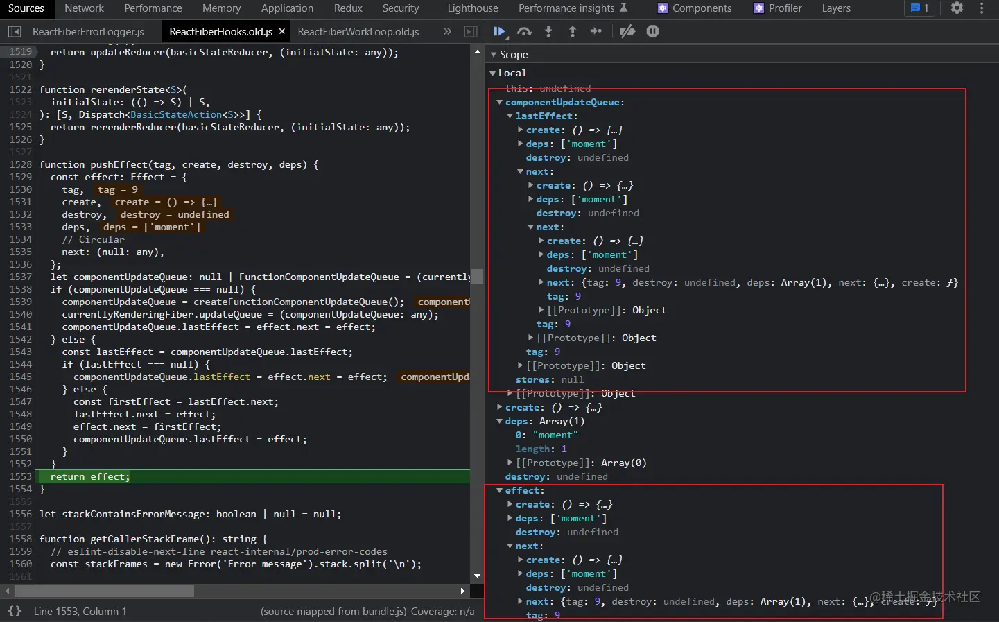 与 useEffect 不同的是,它不用数组去存储销毁和创建函数,而是直接操作 fiber.updateQueue。
