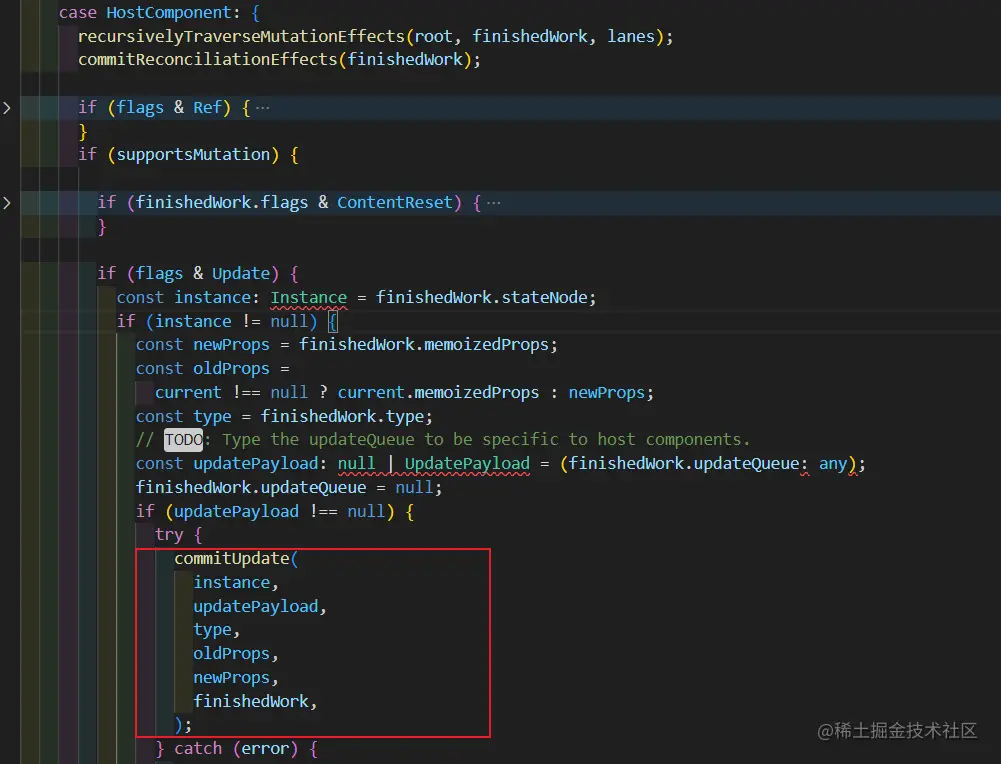 然后将当前节点的实例 instance(实例)、属性更新的有效载荷 updatePayload、节点类型 type、旧属性 oldProps、新属性 newProps 和当前节点的更新队列 finishedWork 作为参数传递给 commitUpdate 函数。