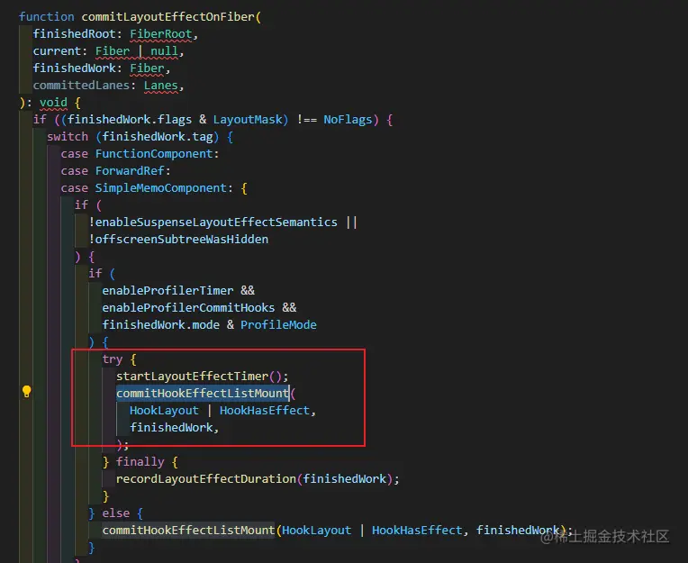 mount(挂载) 阶段, 调用 useState 和 useLayoutEffect 这个 hook(钩),React(反应) 内部会调用 mountEffect 和, 代码如下图所示: