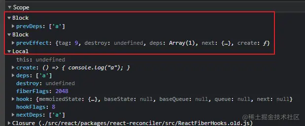 它的第一个参数就是一个 create 函数, 就是我们在使用 useEffect 中传入的第一个回调函数, 也就是 create 函数。而第二个参数就是我们传进去的依赖数组。