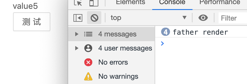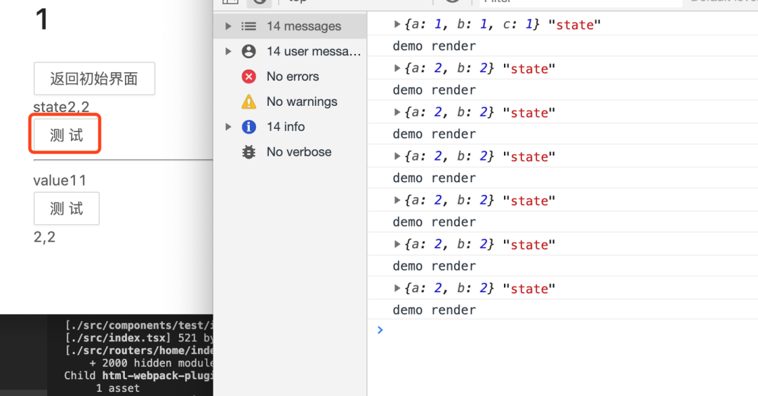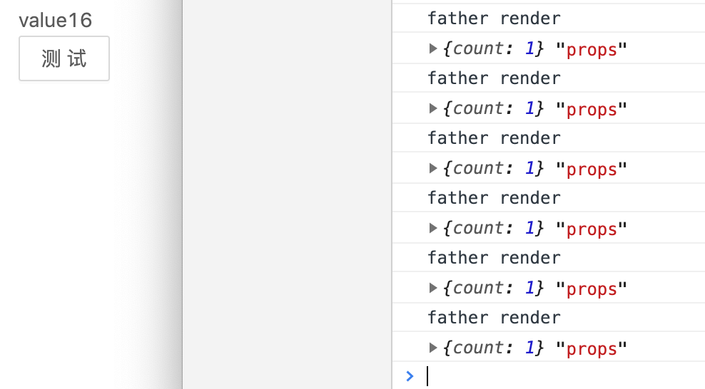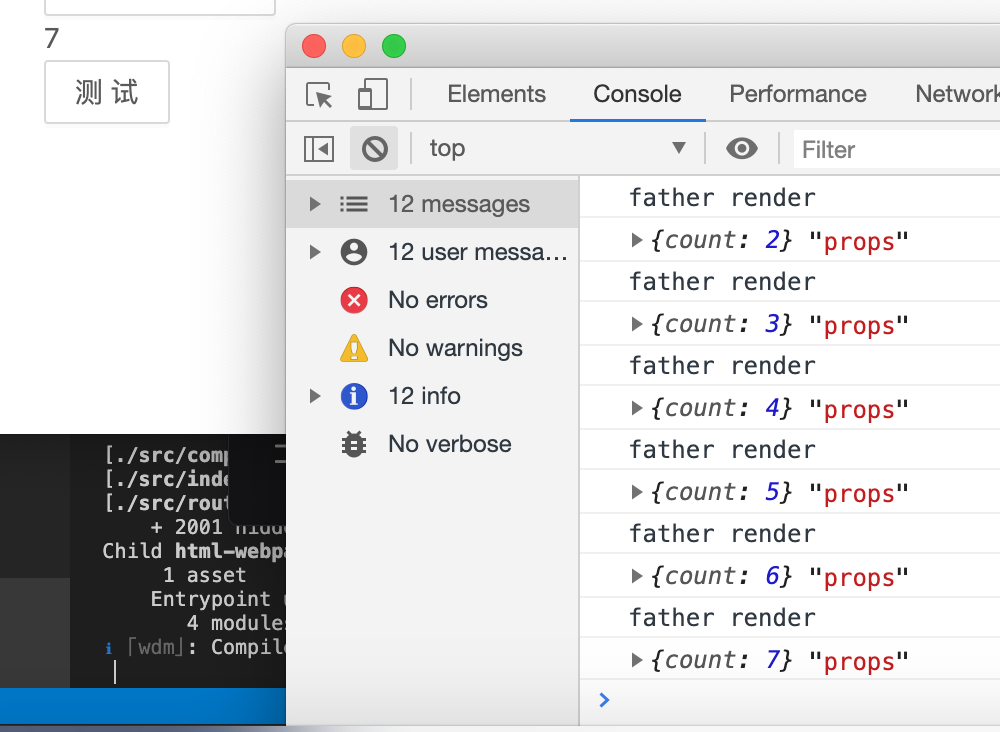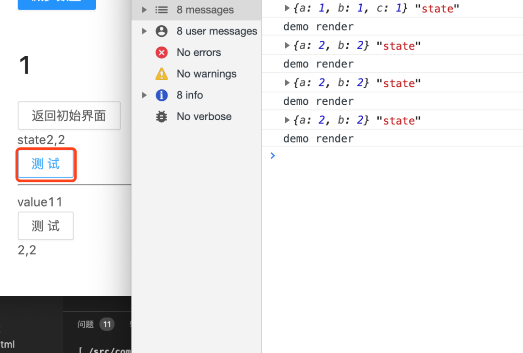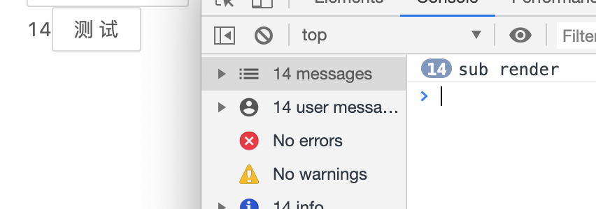 }结果每次点击图中的测试按钮,子组件 Demo 都会重新 render: