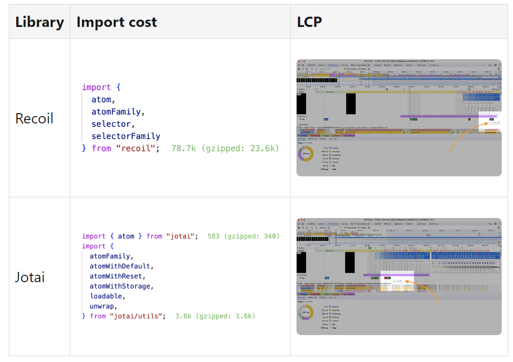 你可能会争辩说体积上的 2 万字节差异不算太大, 但我们来看看在一款非常旧的安卓设备上运行的基准测试, 在这些设备上卡顿会非常明显。正如你所看到的, Jotai 的内部逻辑需要的总体计算更少, 这提高了我的应用的 LCP(一个重要的核心网站体验指标) 从约 2.6 秒到约 1.2 秒。尽管如此, 这个比较可能没有考虑到 Recoil 做得比 Jotai 更好的其他因素 (超出了我的知识范围)。我只想说 Jotai 团队在性能方面做的很出色。