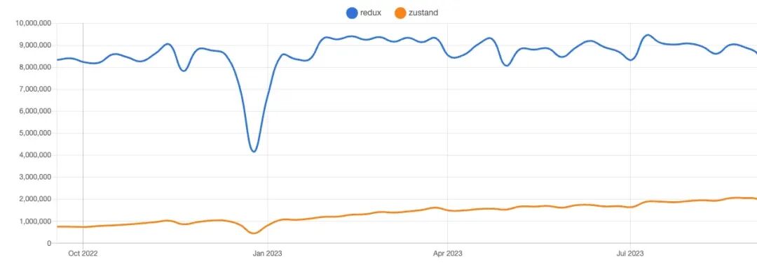 现在最多人使用的状态管理套件是 Redux 跟 Zustand,在 2023 年 9 月的现在,Redux 每周有将近 900 万的下载次数,基本上只要想到状态管理就会想到 Redux。而 Zustand 目前每周也有 200 万的人数,在 2019 年发布之后,至今已经是第二多人使用的状态管理套件,比起老牌的 Mobx 其每周下载量多了将近一倍。