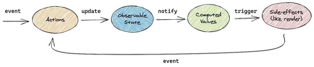 })Mobx 的实施机制是看到目前为止最特别也是最复杂的,简单来说,Mobx 的机制是观察者模式,在使用 store 中的状态时会触发订阅,而状态改变时 Mobx 会通知相应的组件触发更新。