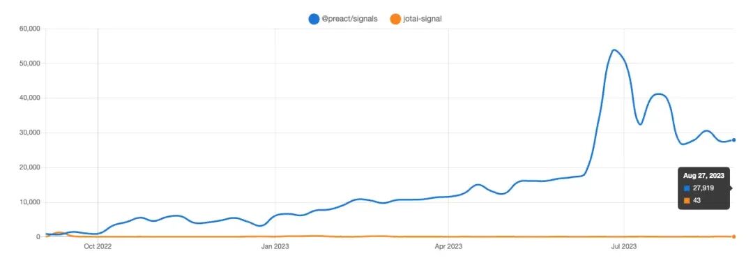 在今年年初的时候 signal 突然变成热门的关键字之一,以 React 的生态系来说有两个组件相继出现,分别是 @preact/signals 、 jotai-signal,但从下载量来看,目前使用这两个组件的人数极少,后续在文中会提到为什么比较少人使用的原因。